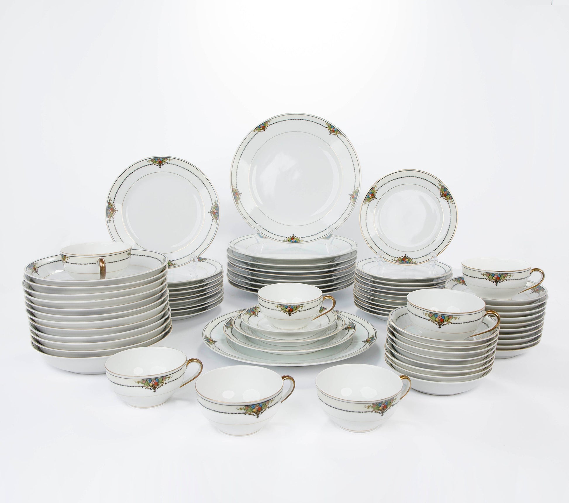 Antique (circa 1921) Art Nouveau Noritake Gotham (Gold) China Set. White with a cream band containing delicate black scrolling and depictions of flowers and fruit in urns. Gold trim and accents. Hand-painted. The set contains almost service for eight (missing one teacup) with many extra pieces, plus serving dishes for a total of 75 pieces. It is rare to find an (almost) complete set like this! See details below.