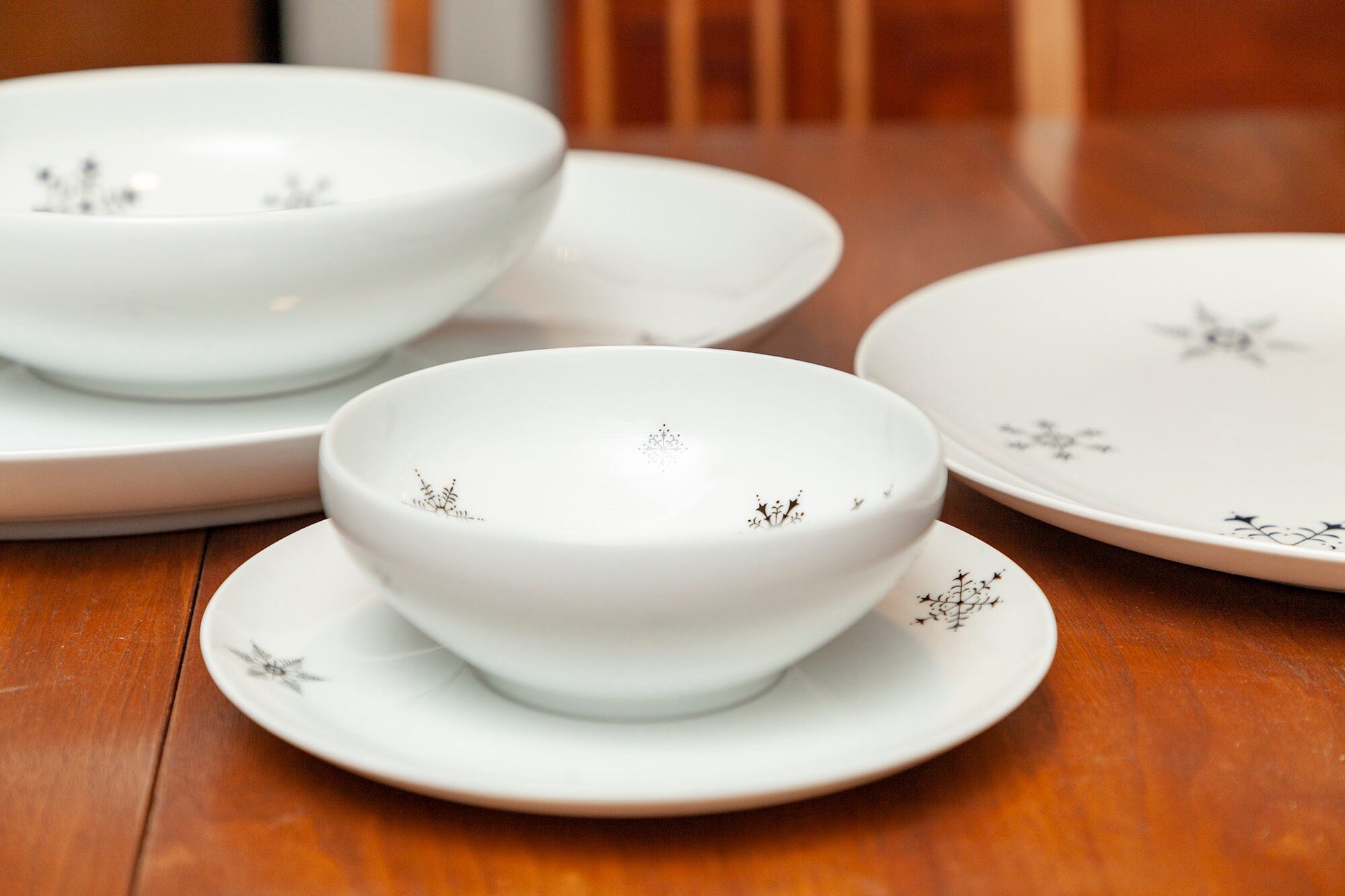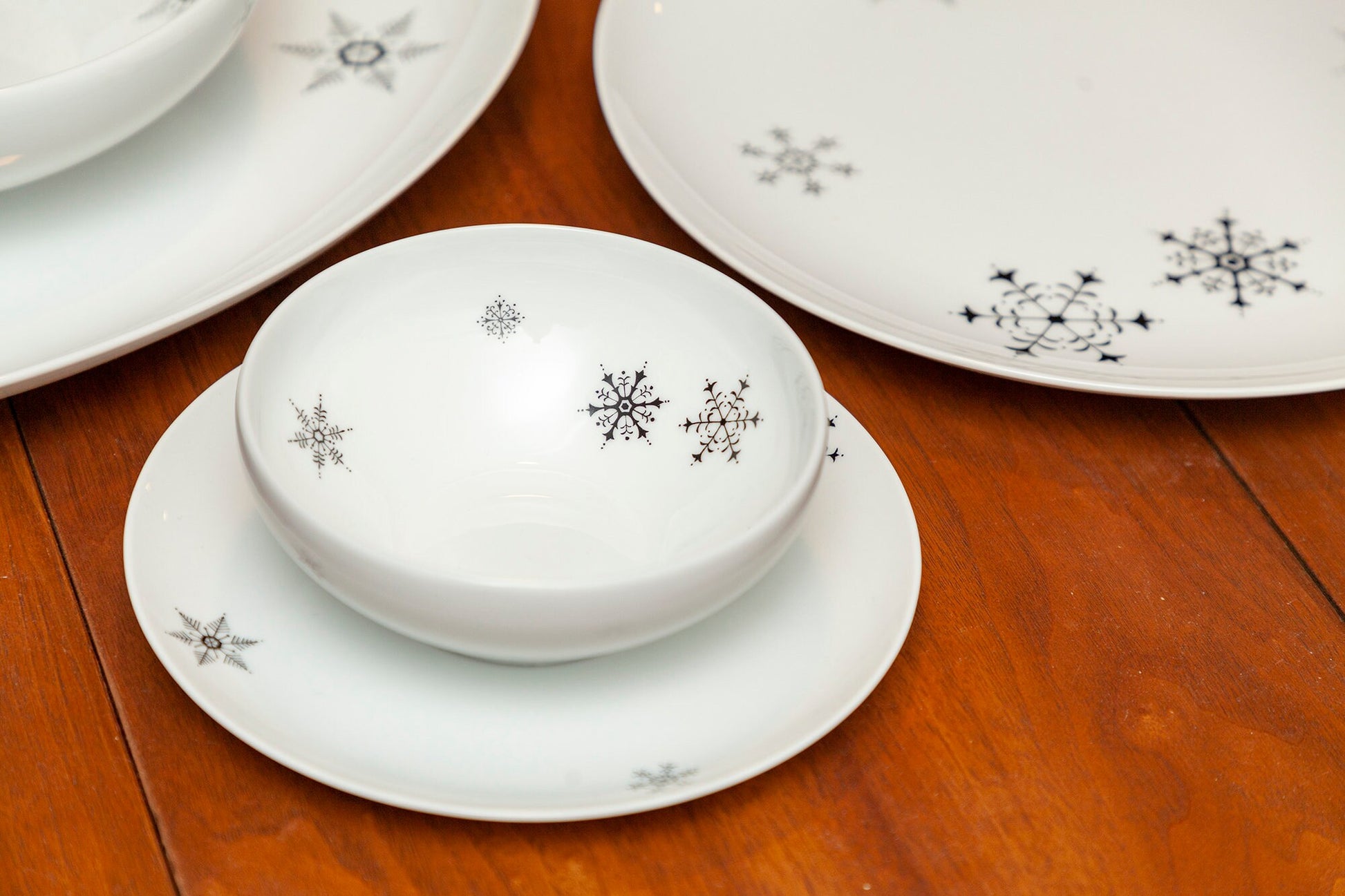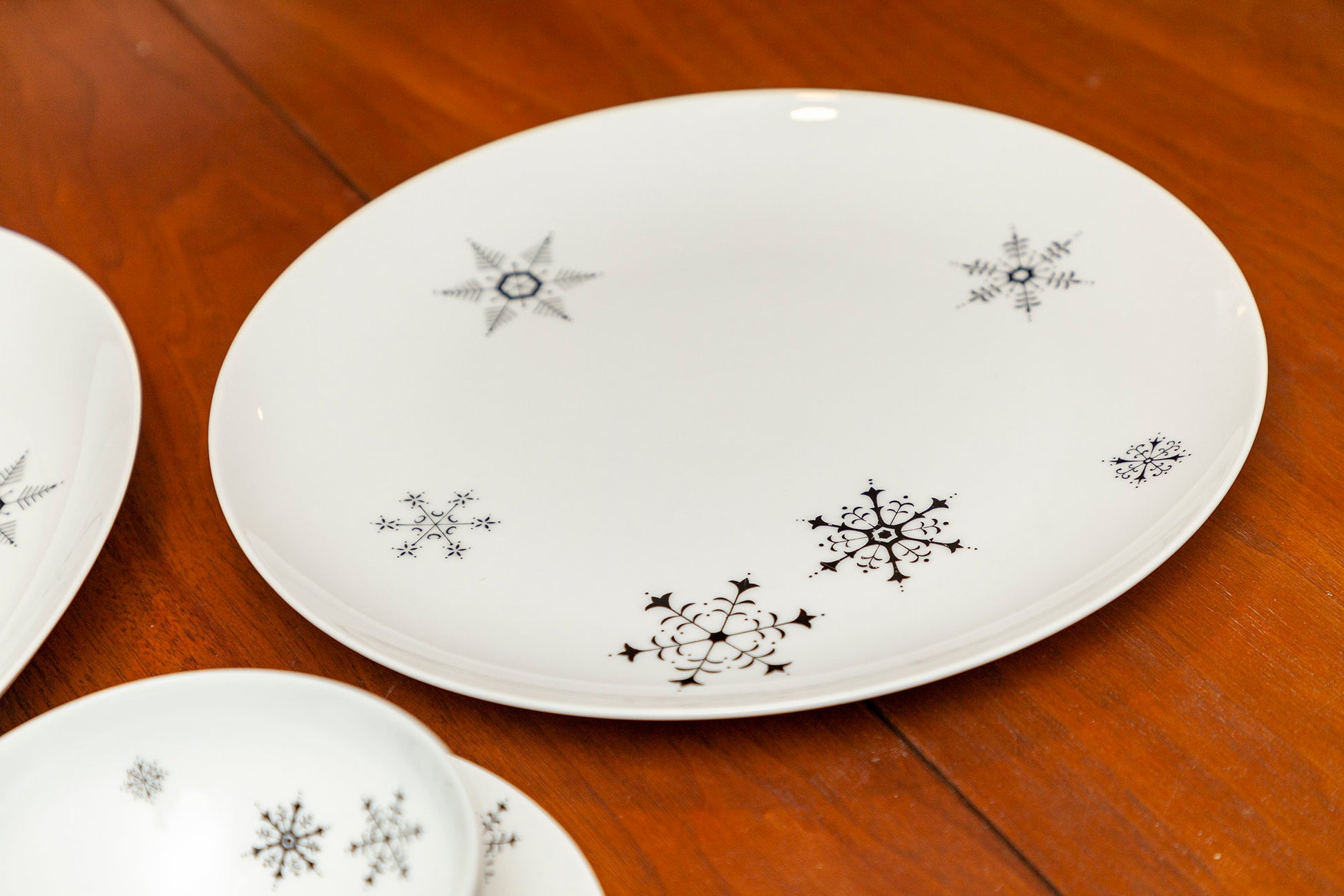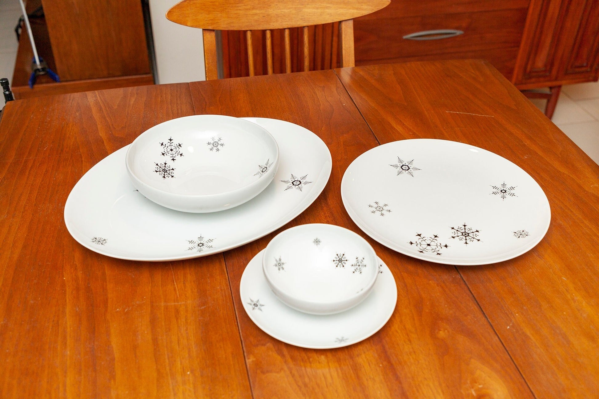 Vintage Rare ACI Fine China - "Fantasy" - 4 Piece Serving Set - Serving Platter and Serving Platter, Serving Bowl and Gravy Boat. Classic mid-century modern china with simple black snowflakes in various sizes on a white background. This pattern is rare and very difficult to find.