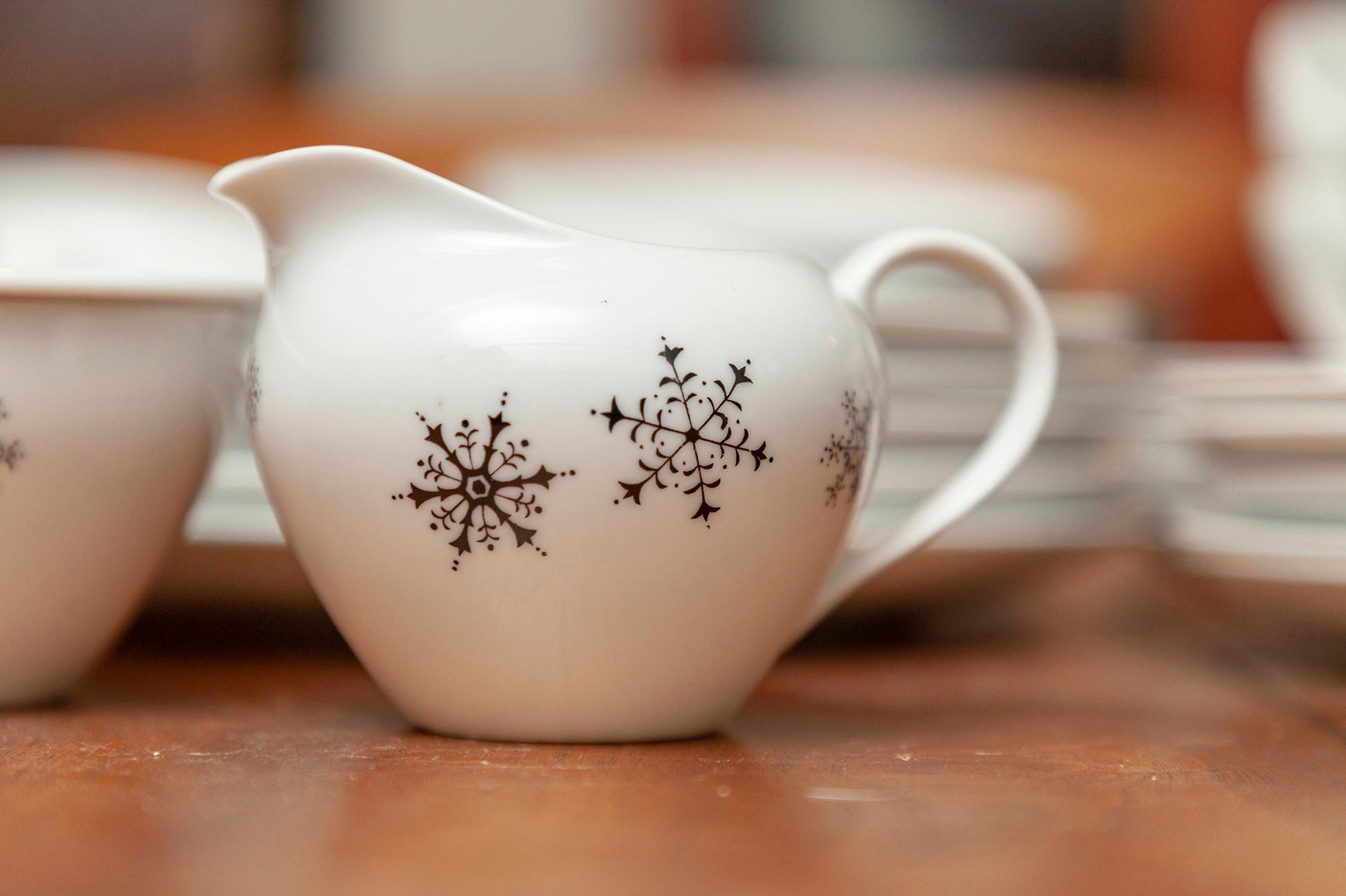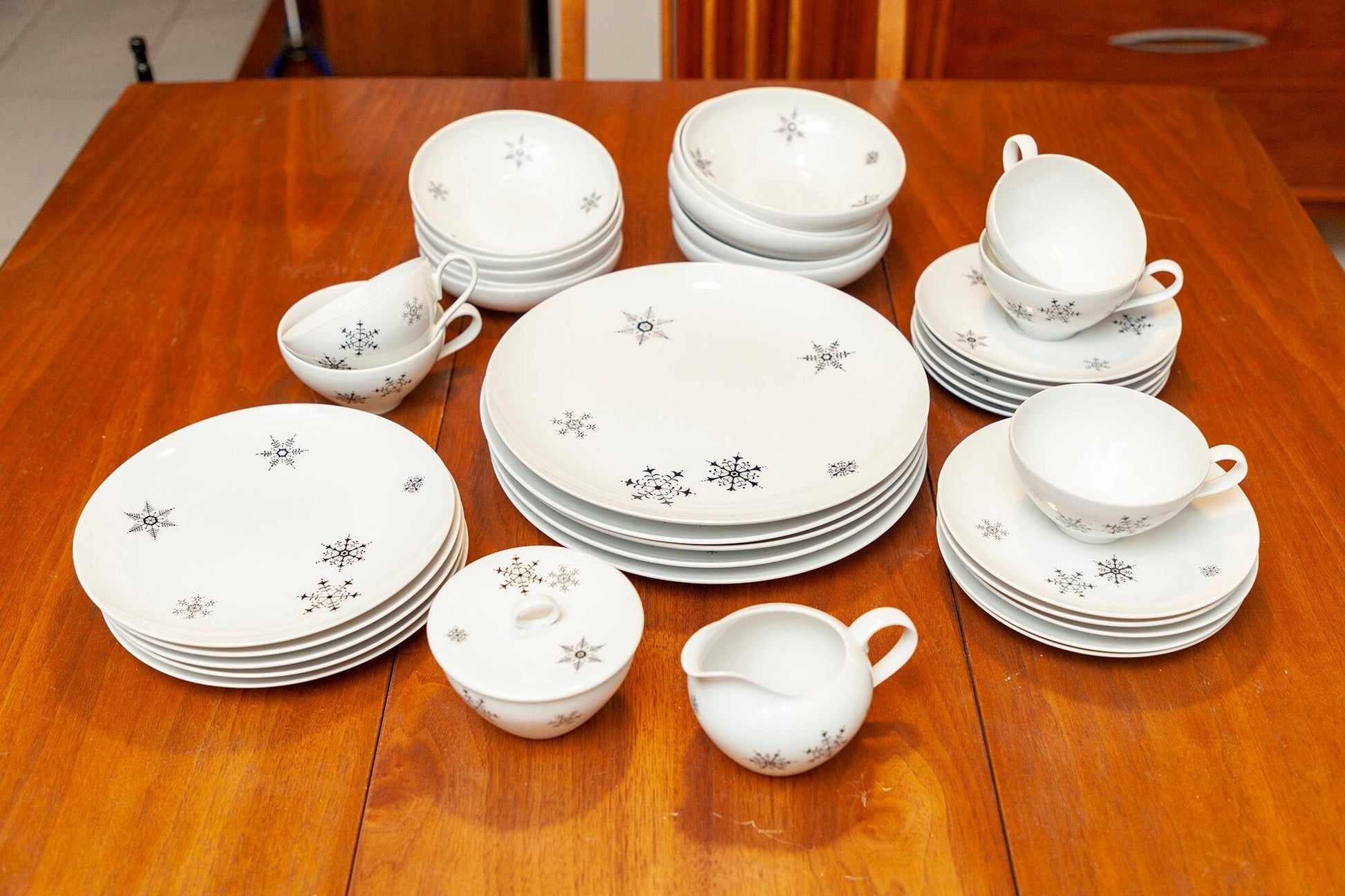 Vintage Rare ACI Fine China Set - "Fantasy" - Service for 5, plus Sugar, Creamer, Soup Bowls and Fruit/Dessert Bowls. Classic mid-century modern china with simple black snowflakes in various sizes on a white background. This pattern is rare and it is very difficult to find complete place settings. This china set includes 5 five piece place settings, 5 soup bowls, 5 fruit/dessert bowls, sugar bowl and creamer, for a total of 37 pieces.