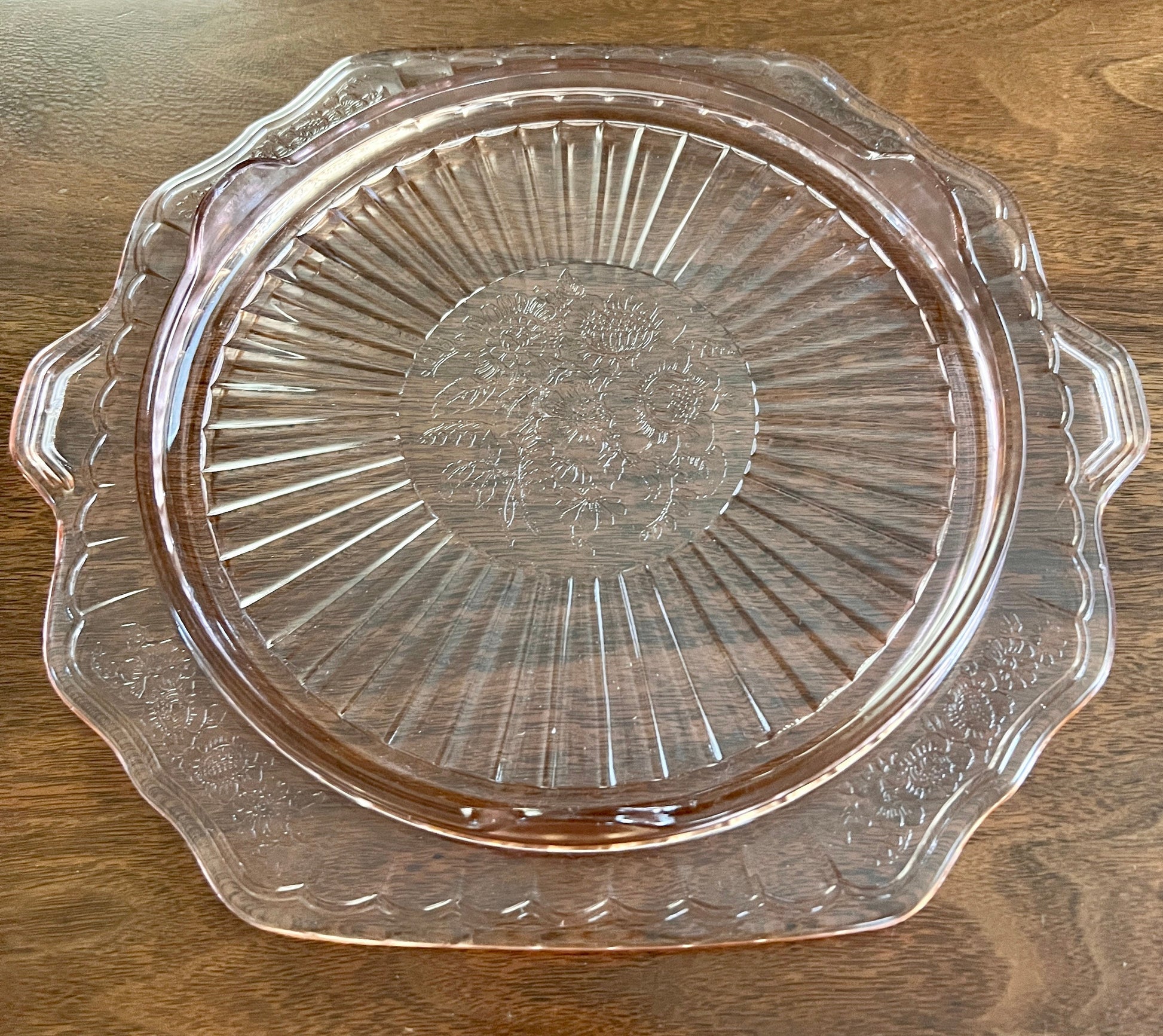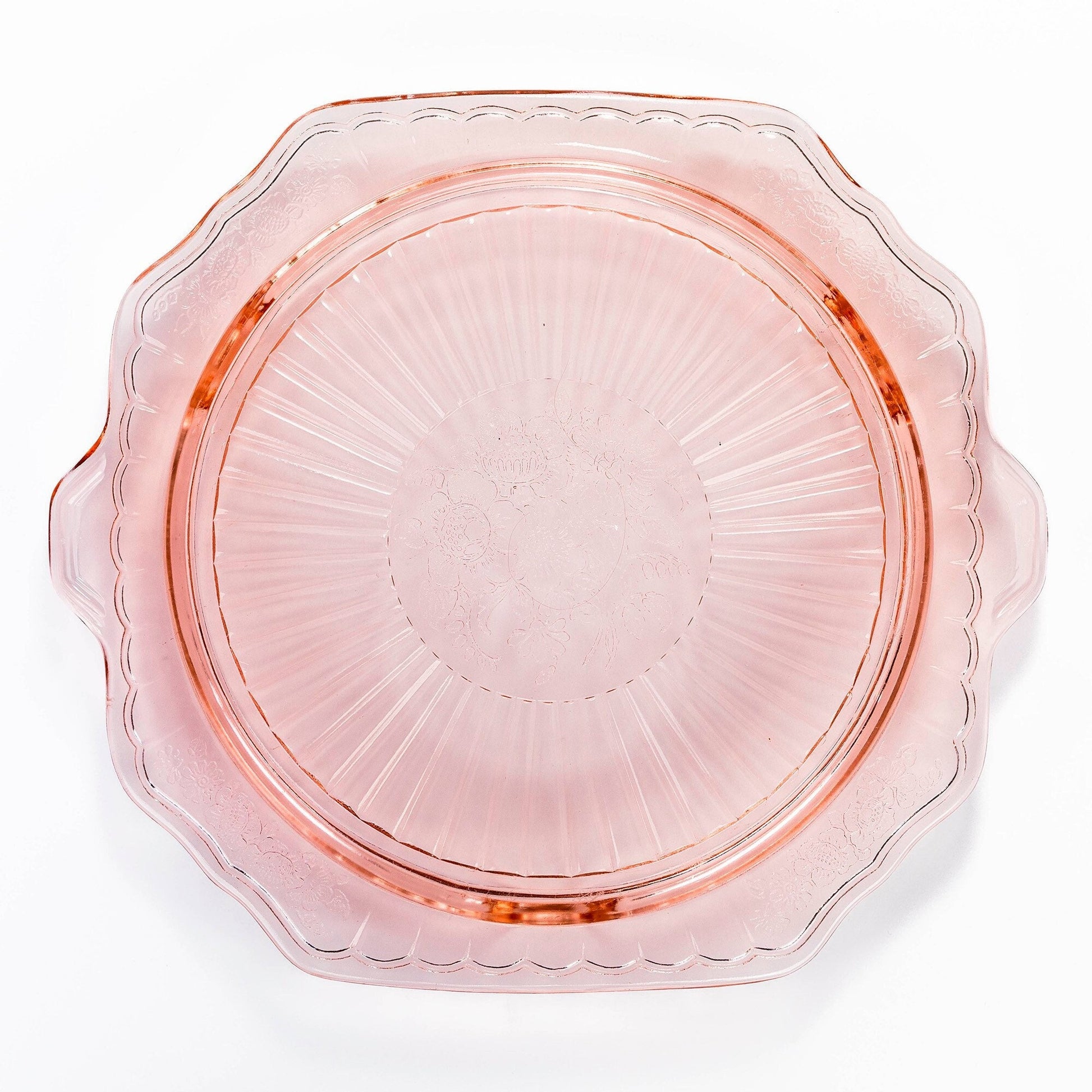 Absolutely beautiful vintage Anchor Hocking Depression Glass Open Rose/Mayfair Pink footed Cake Plate. Pressed pink glass. Molded handles. Rose pattern in the center of the plate with a ridges extending to the foot. It is delicate and durable at the same time.