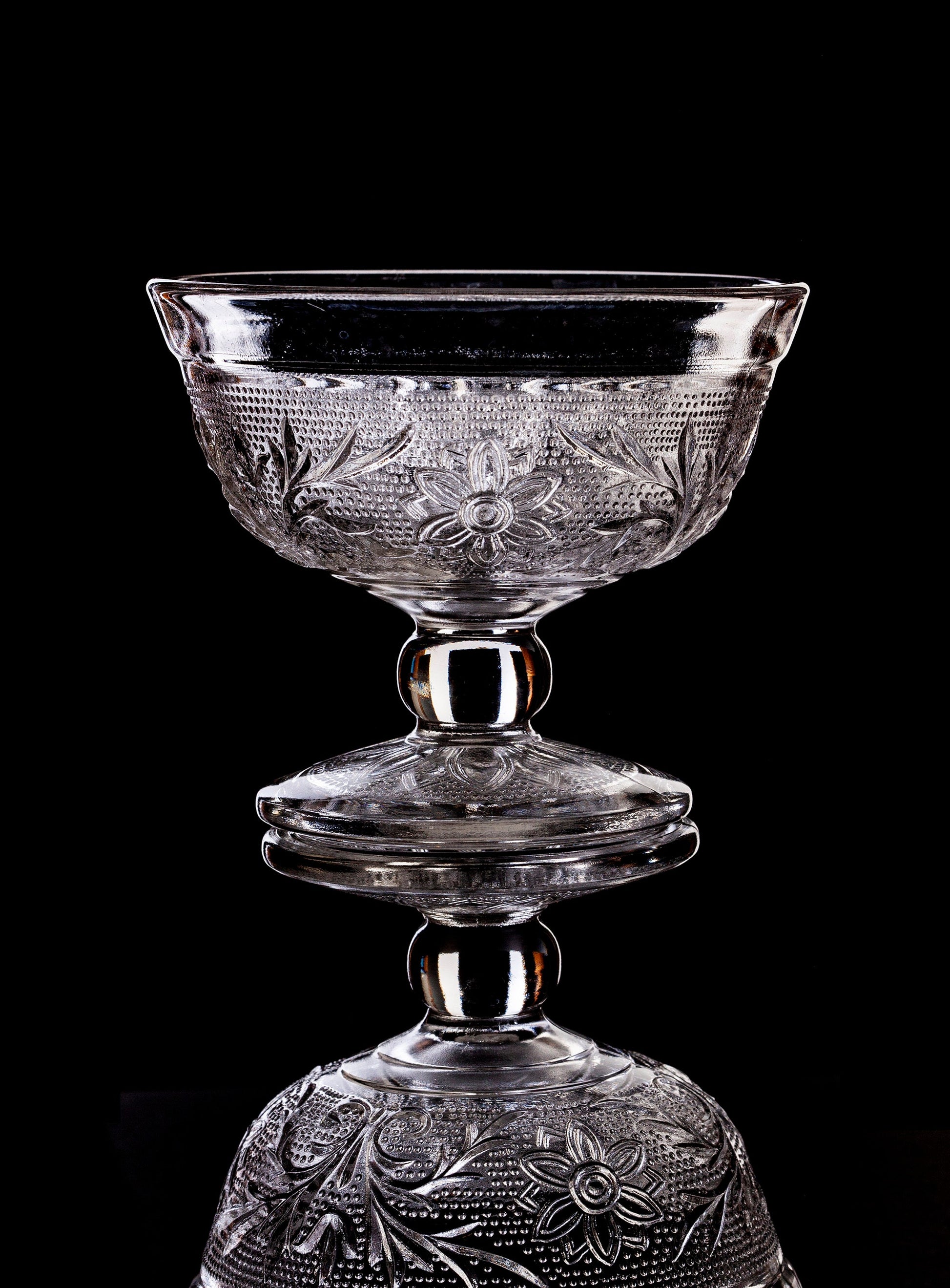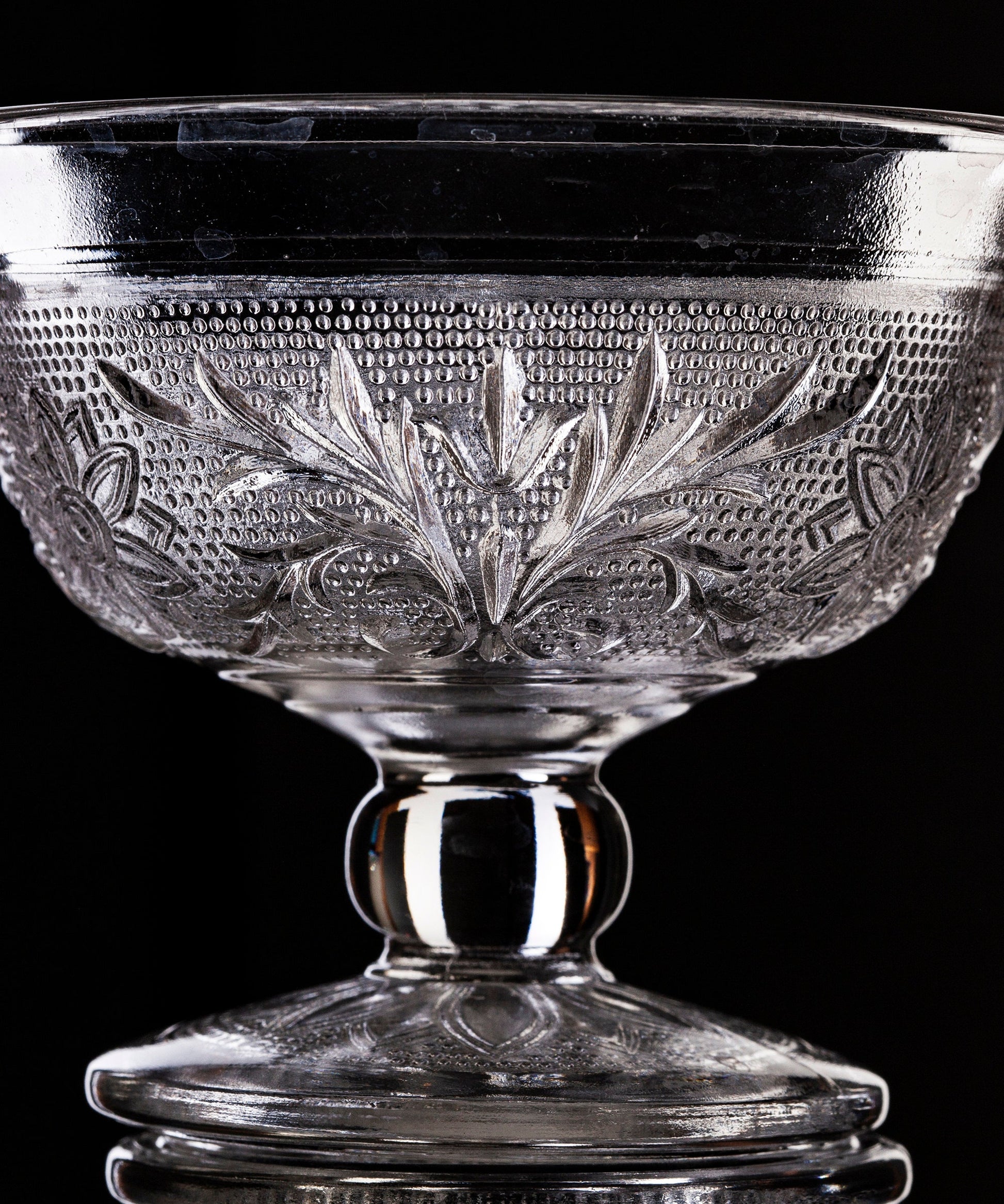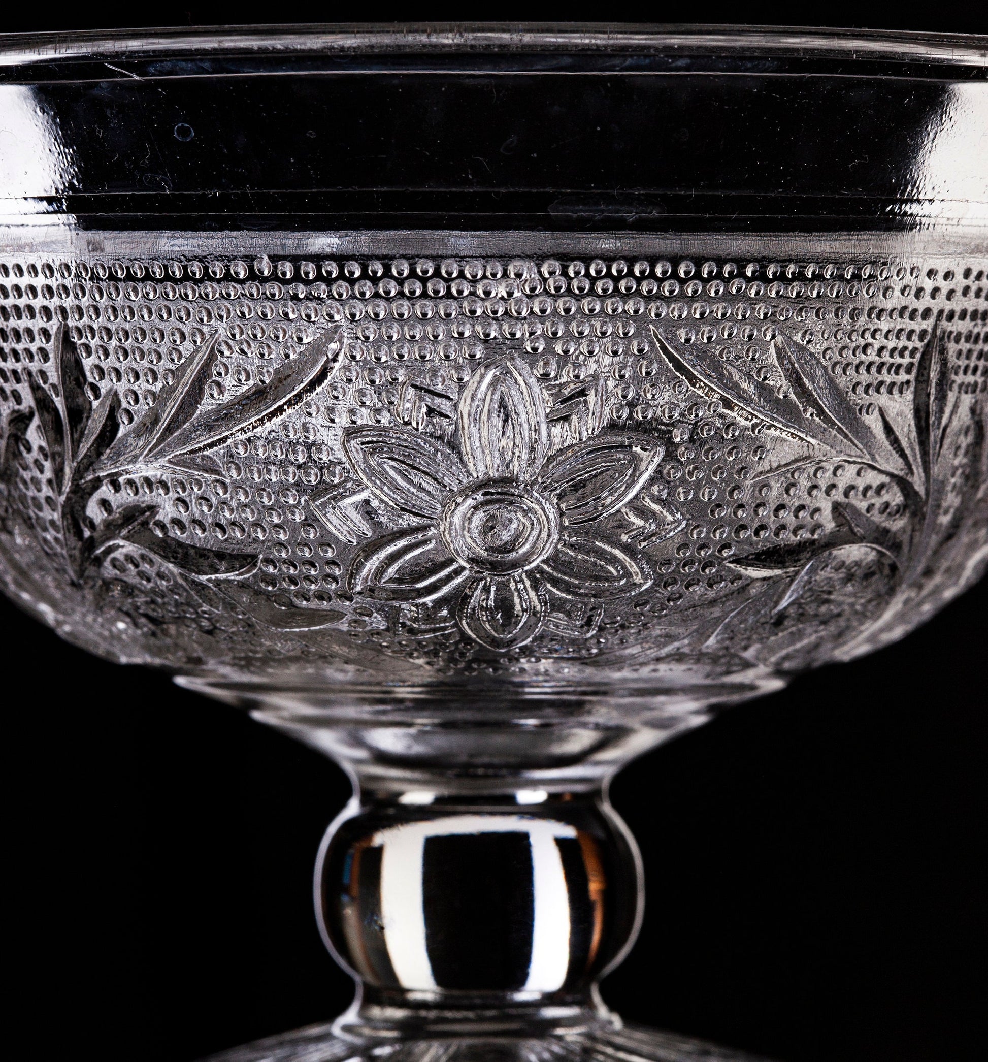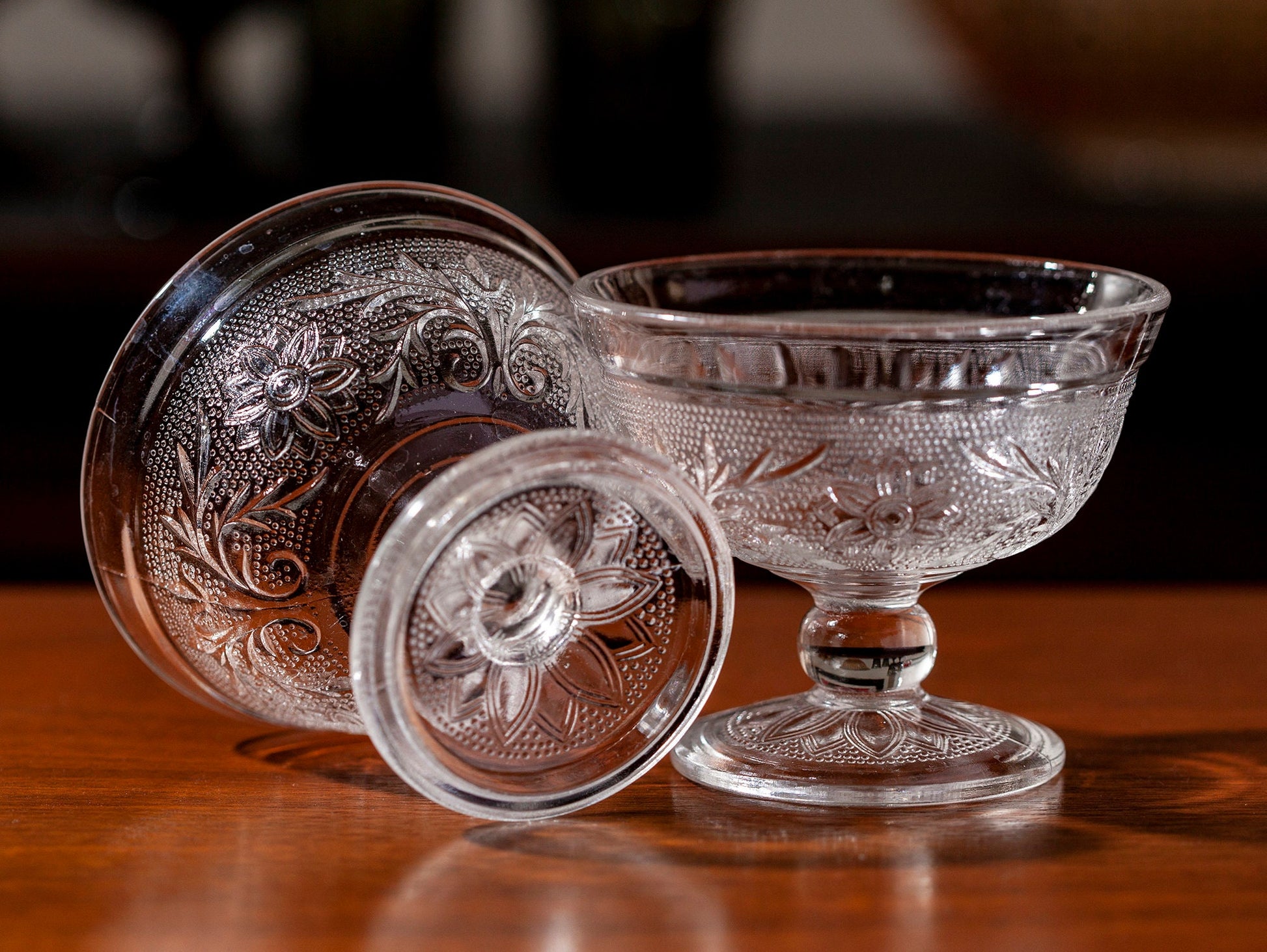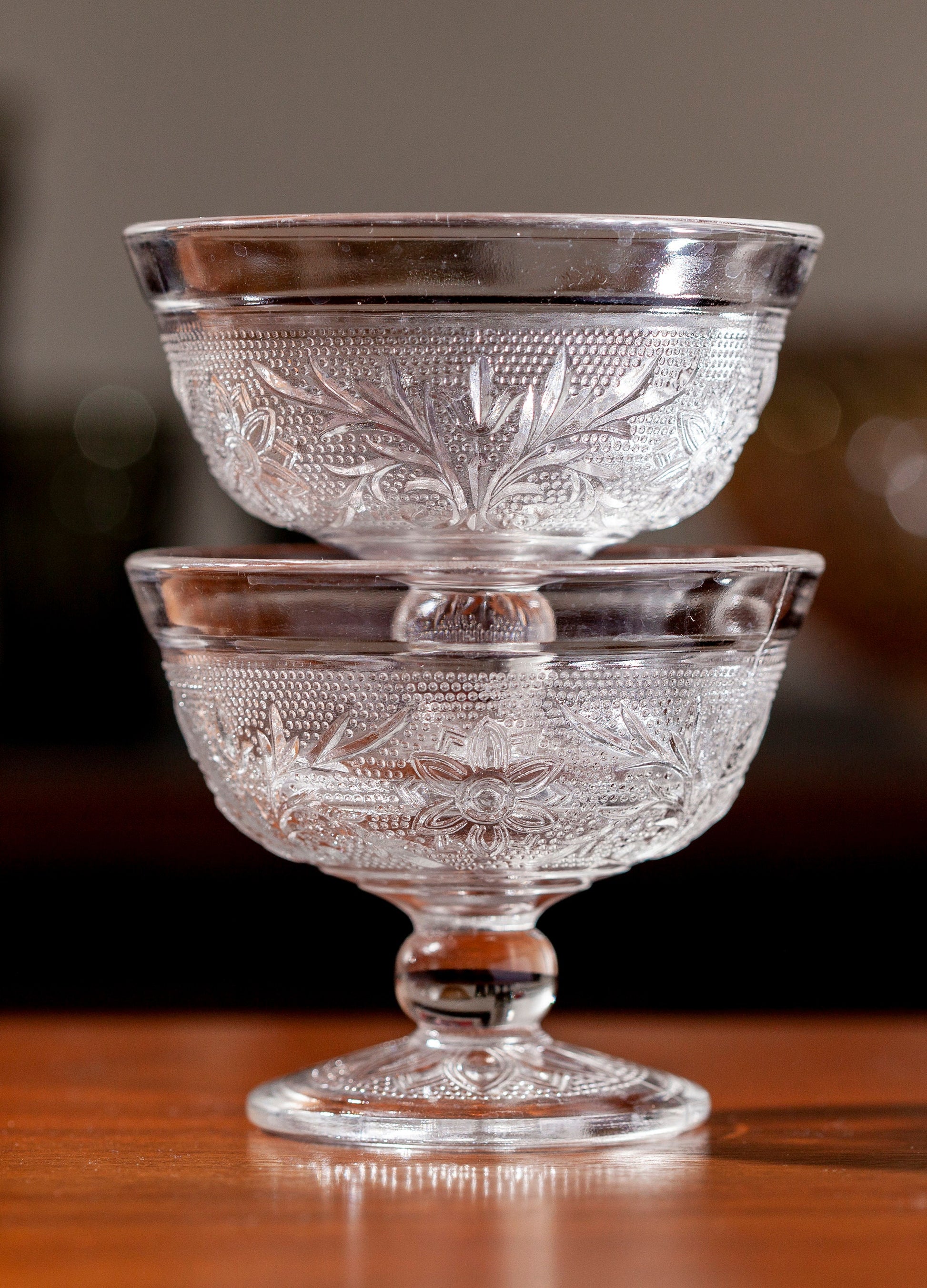 Set of 2 Vintage Anchor Hocking Sandwich Clear Champagne/Tall Sherbet Glasses. Beautiful pressed glass flower and vine pattern on a stippled background. Clear ball stem and patterned foot. Produced between the 1940’s and 1960’s.