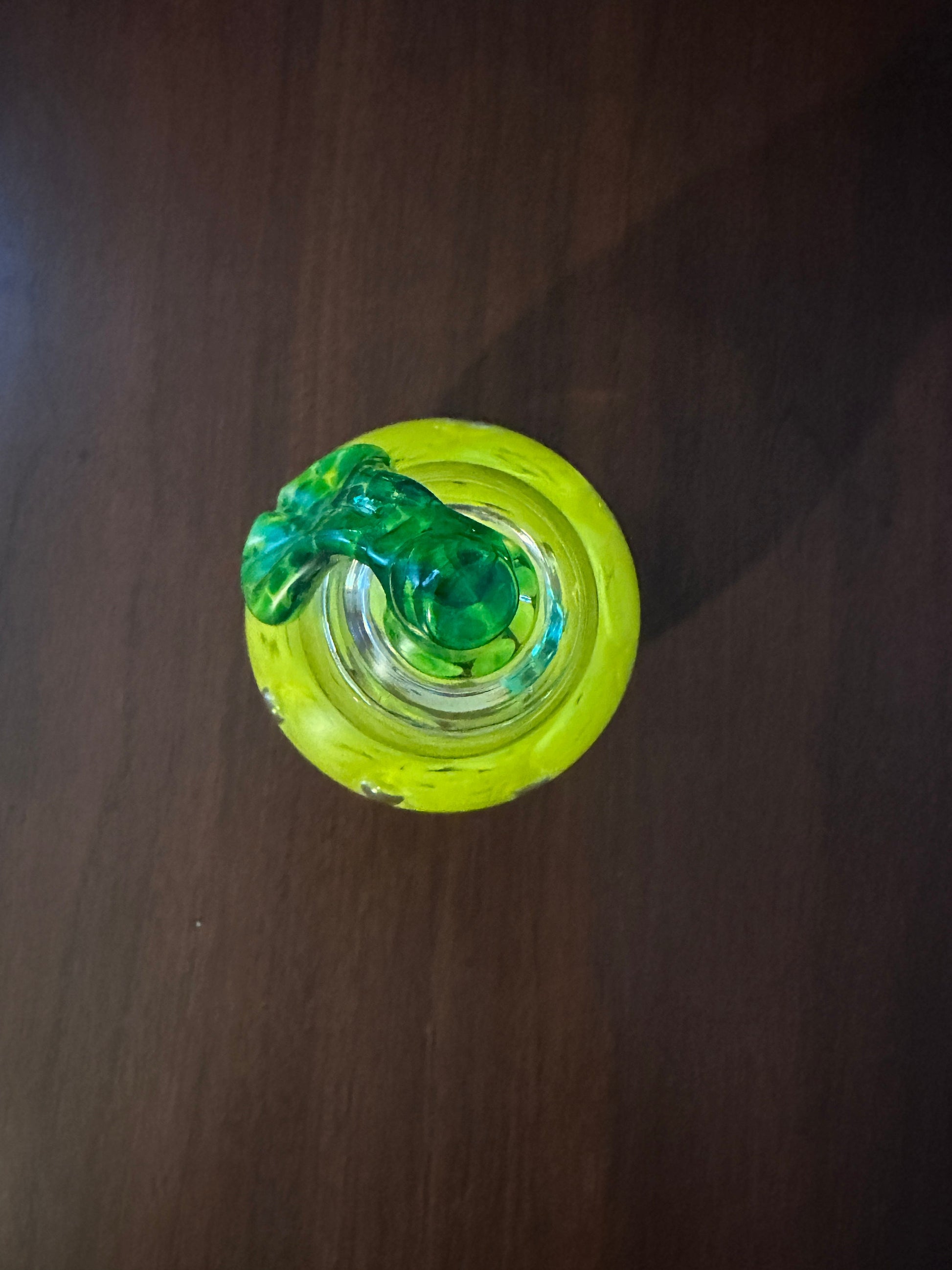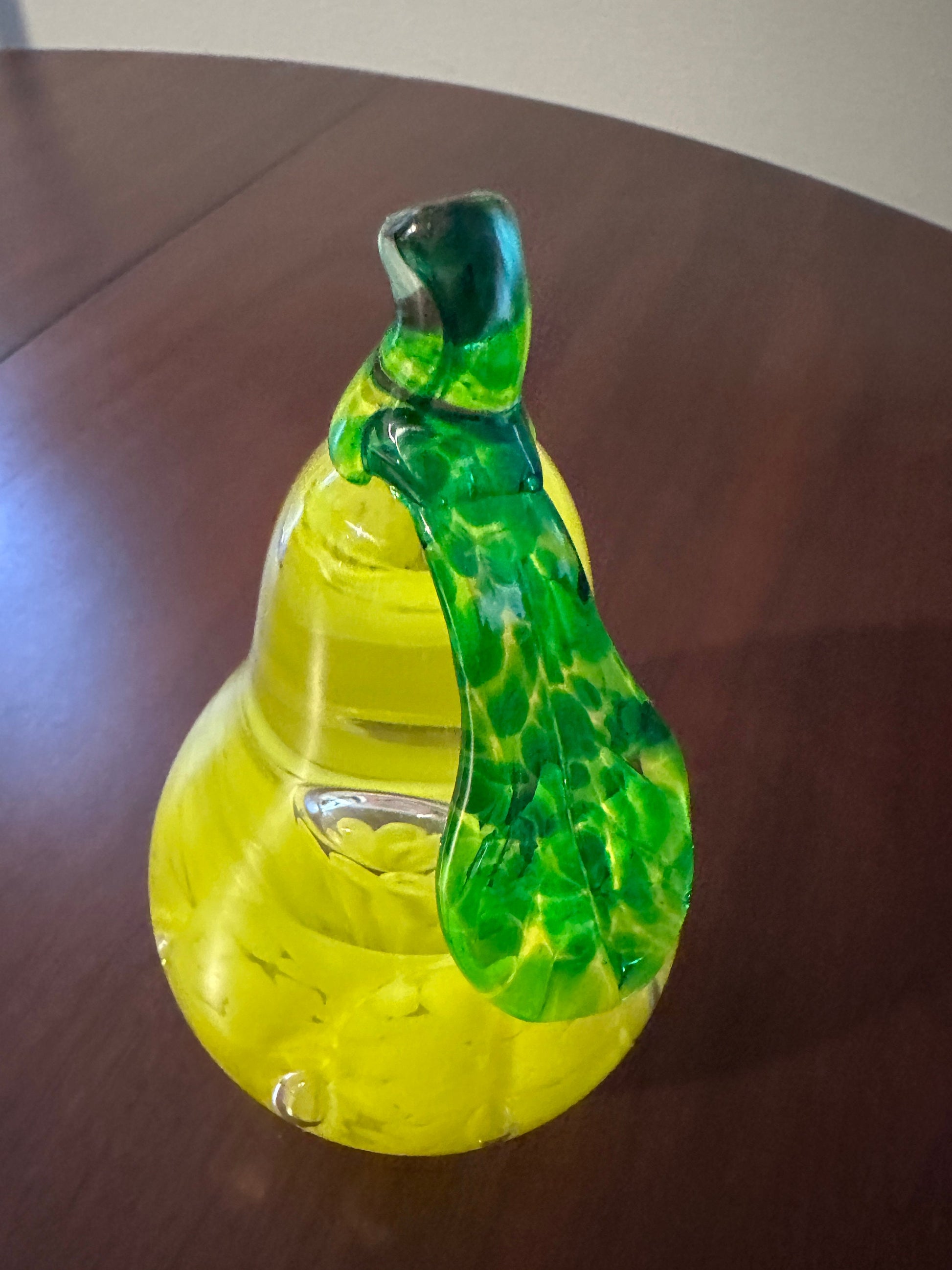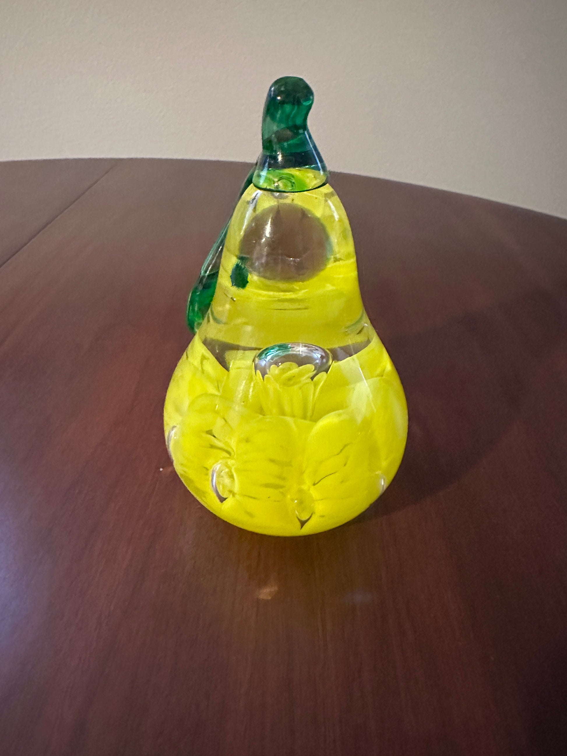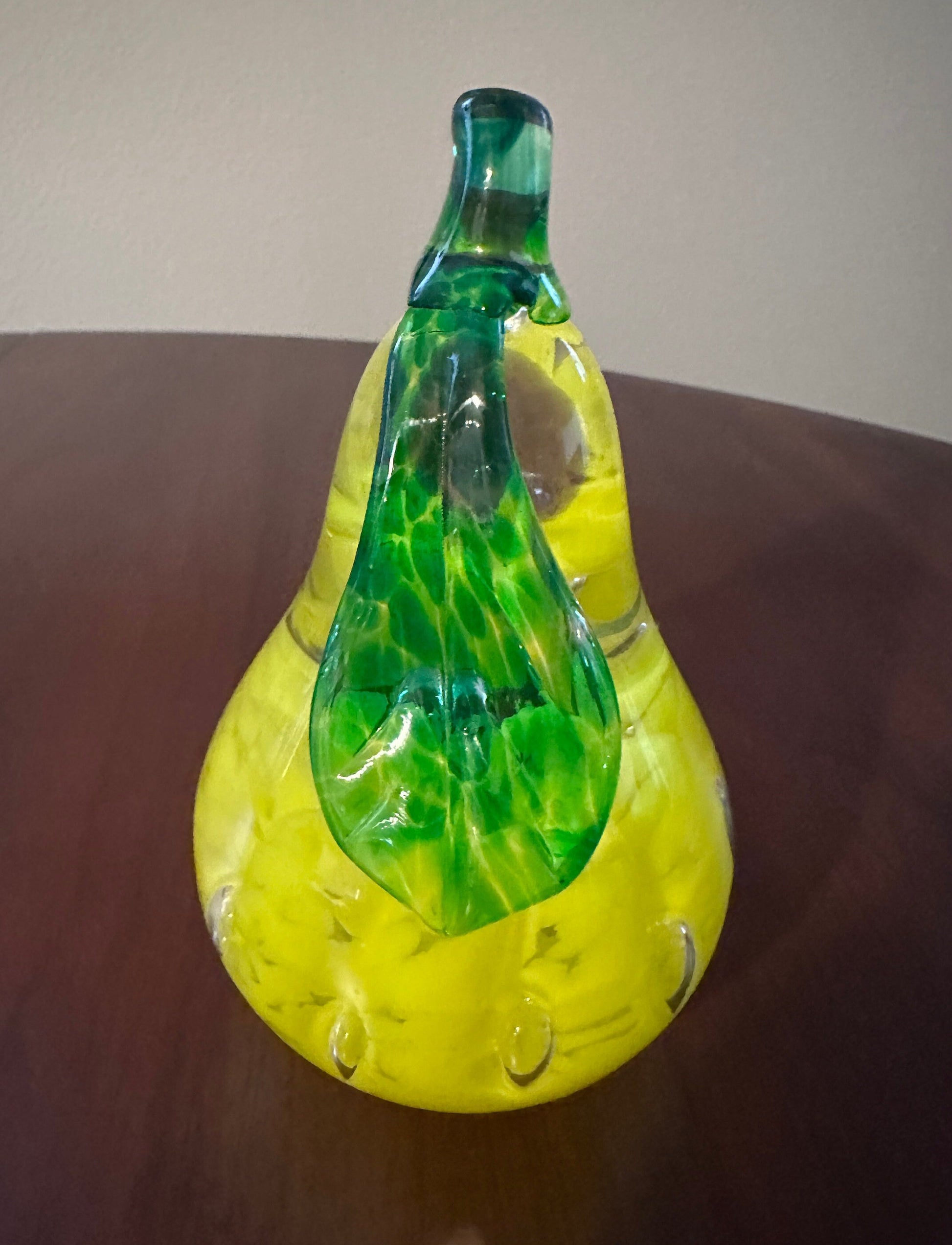 Beautiful vintage Joe Rice stamped art glass pear paperweight. The green and yellow colors in this art glass are vibrant, and the design stands out. It is in very good vintage condition with minimal wear on the bottom. It is stamped Joe Rice 1993 on the bottom and stands about 4 1/2" tall.