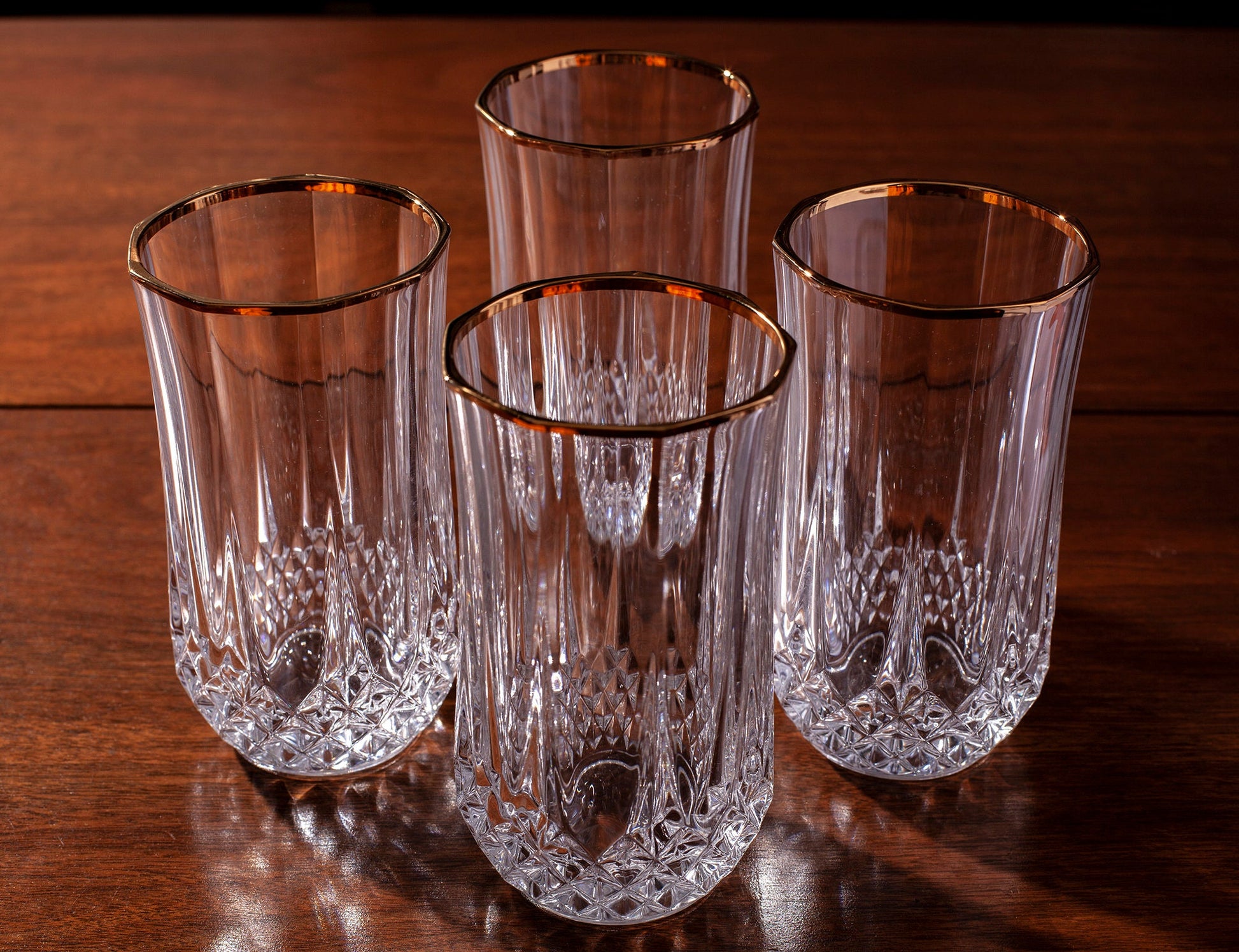 Vintage Cristal D'Arques-Durand Longchamp Gold Crystal Flat Tumblers (Set of 4). Beautiful diamond cut crystal tumblers in the Longchamp pattern with gold trim! In the original box. Made in France.