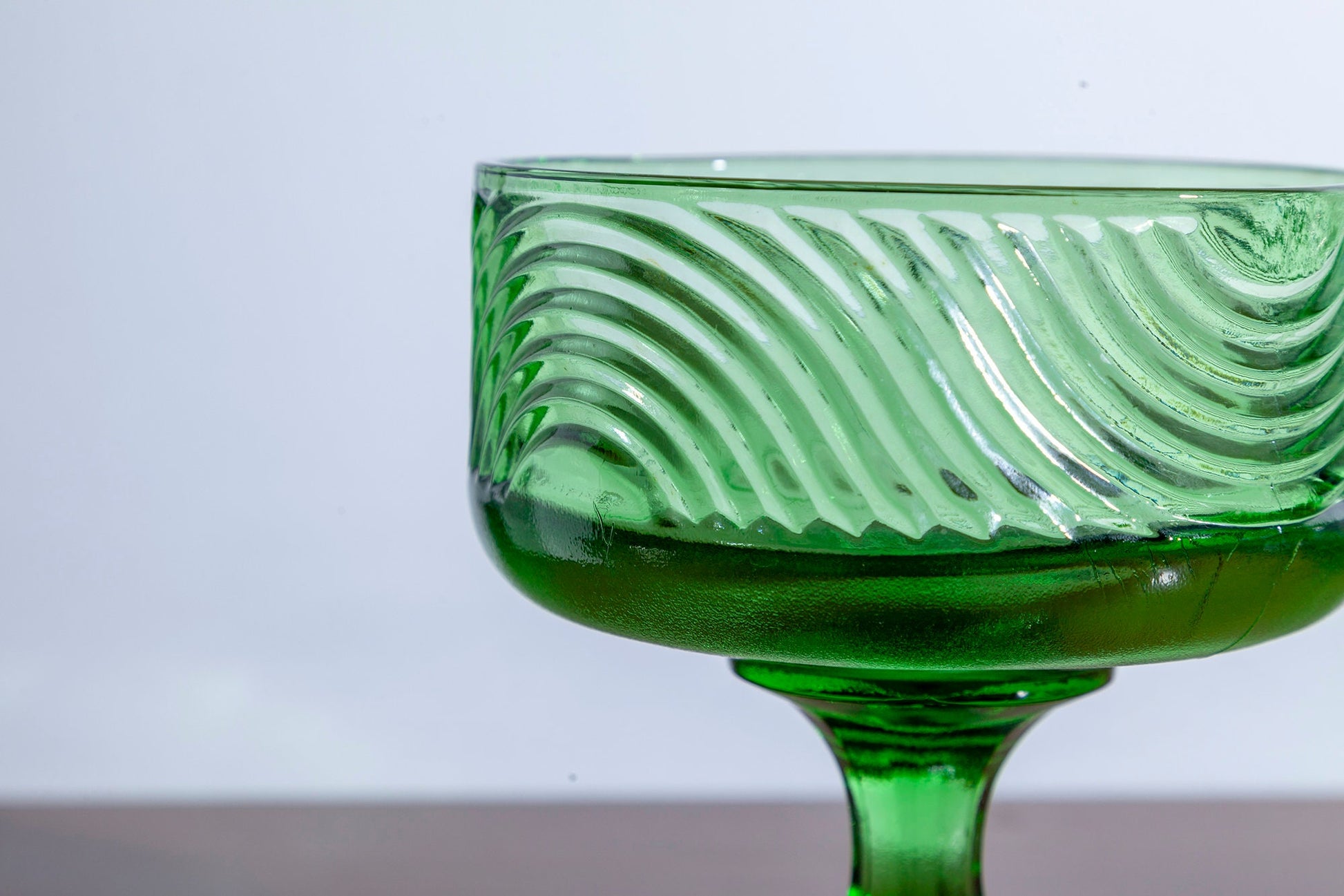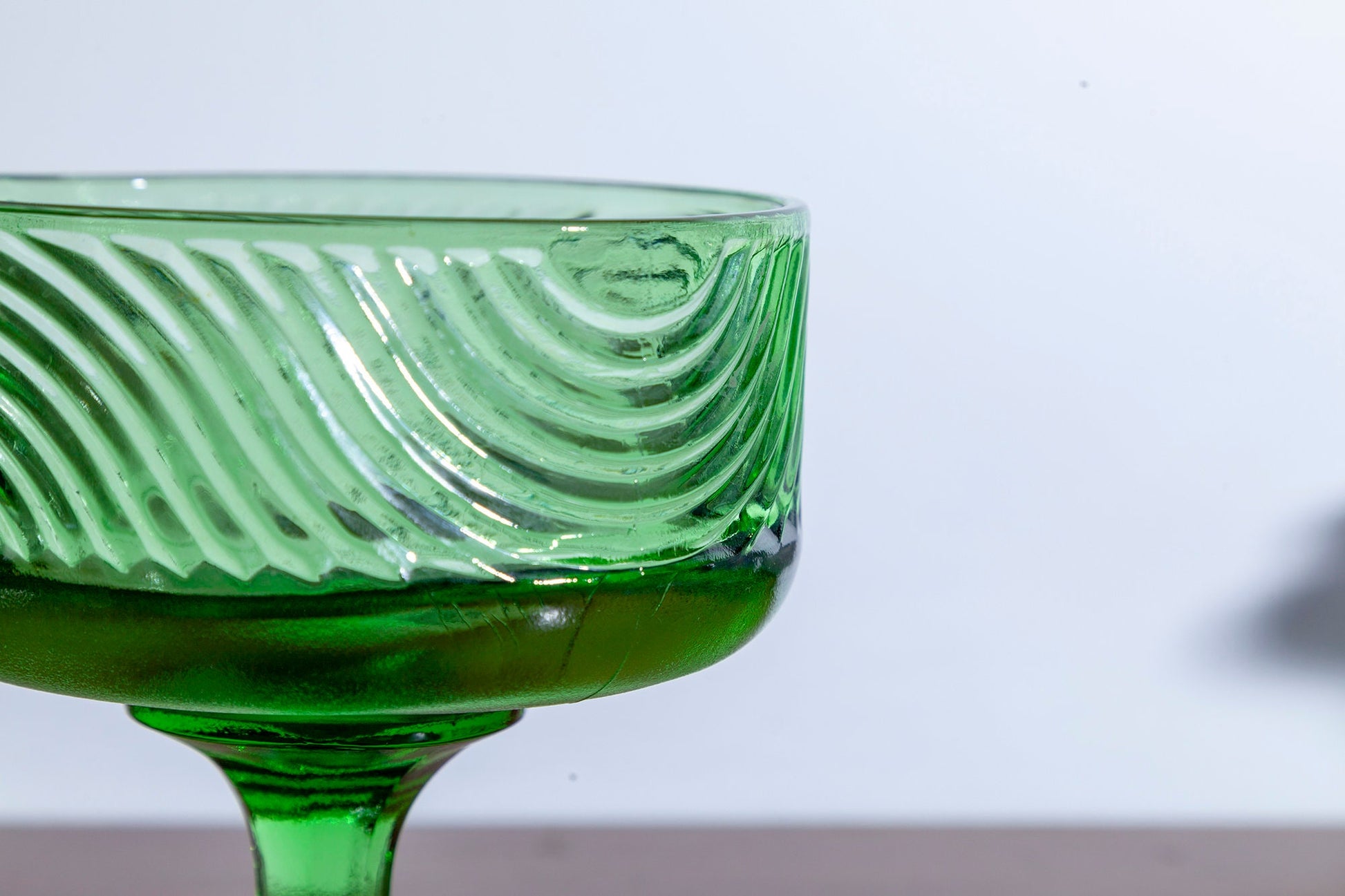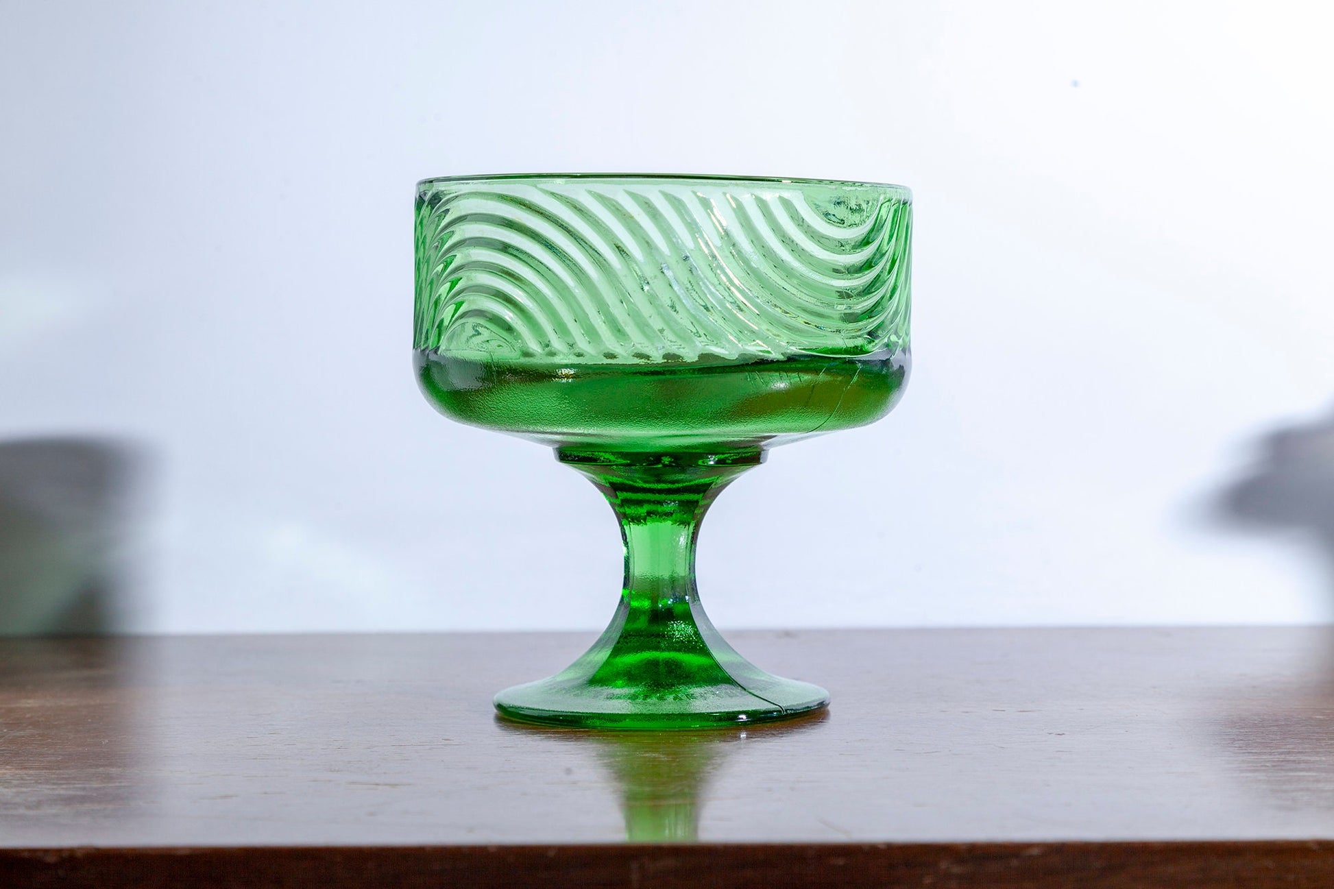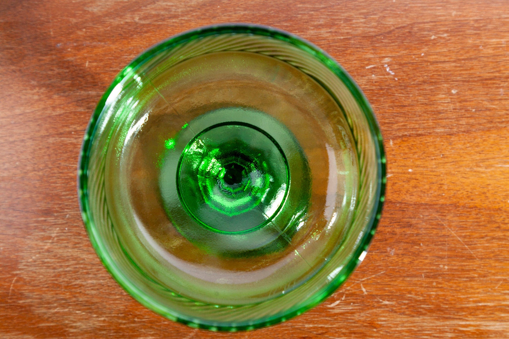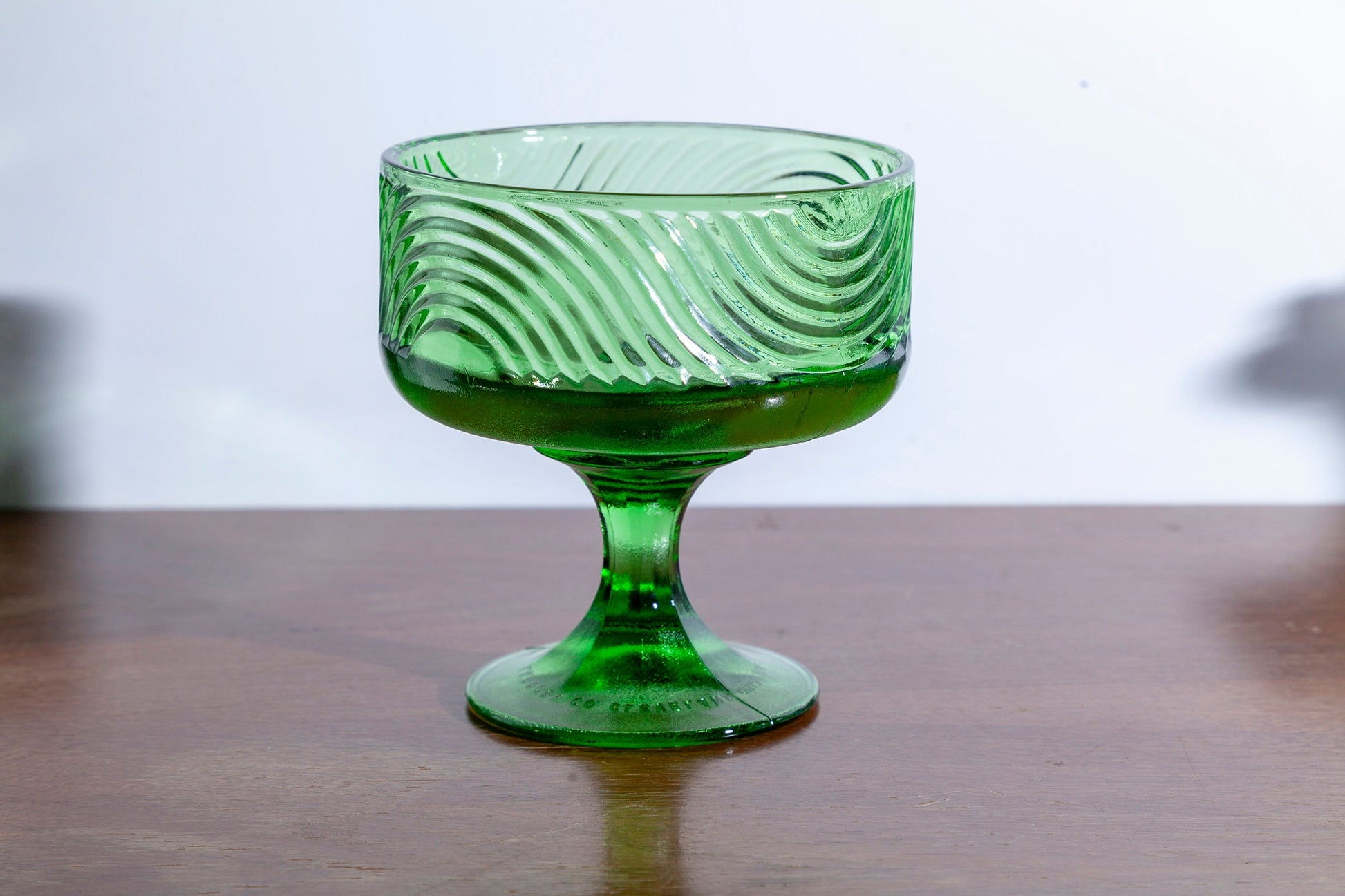 This vintage E.O. Brody Green Glass Pedestal Compote Bowl has a mid century modern curved line design along the bowl - simple but striking.