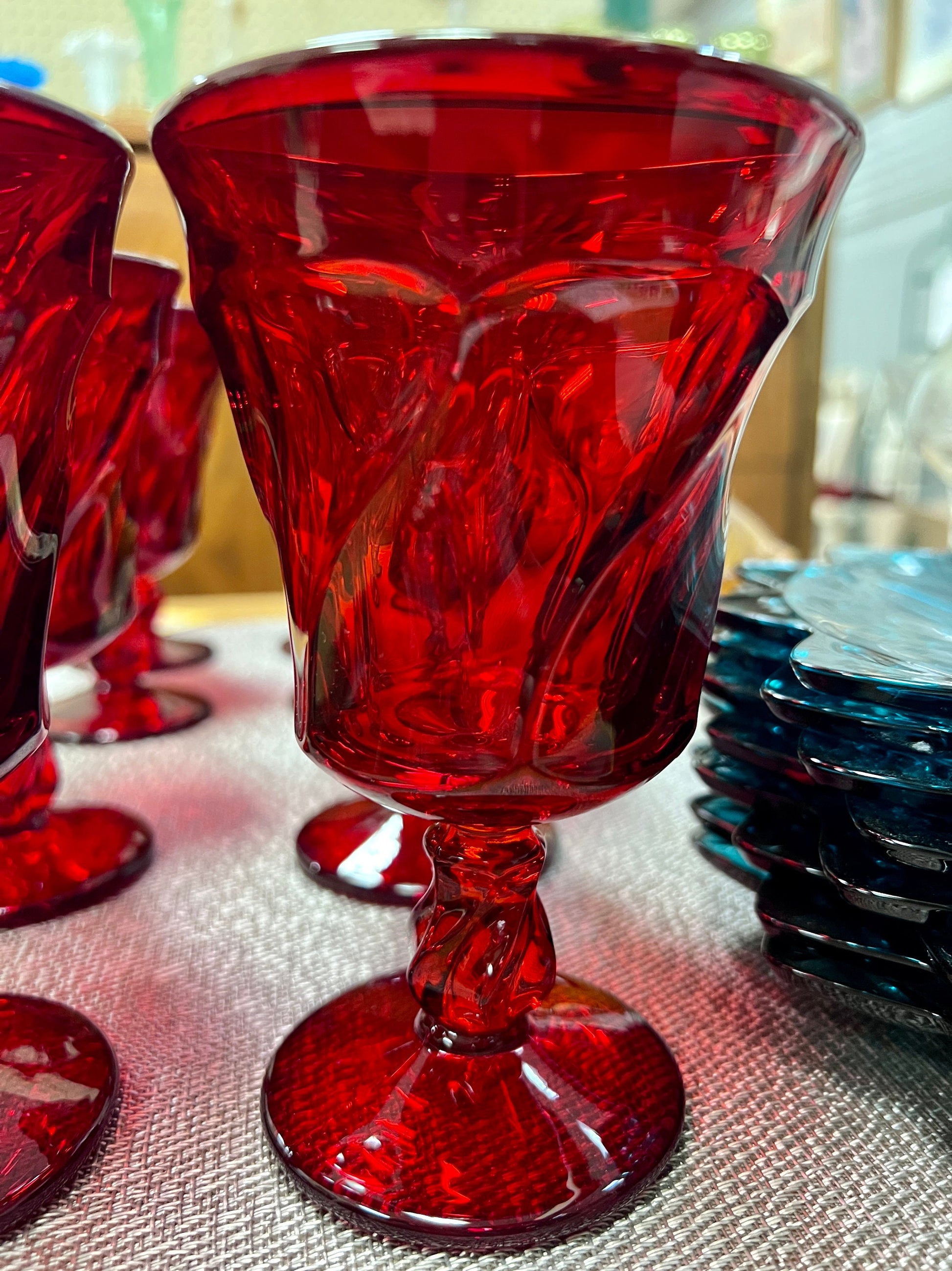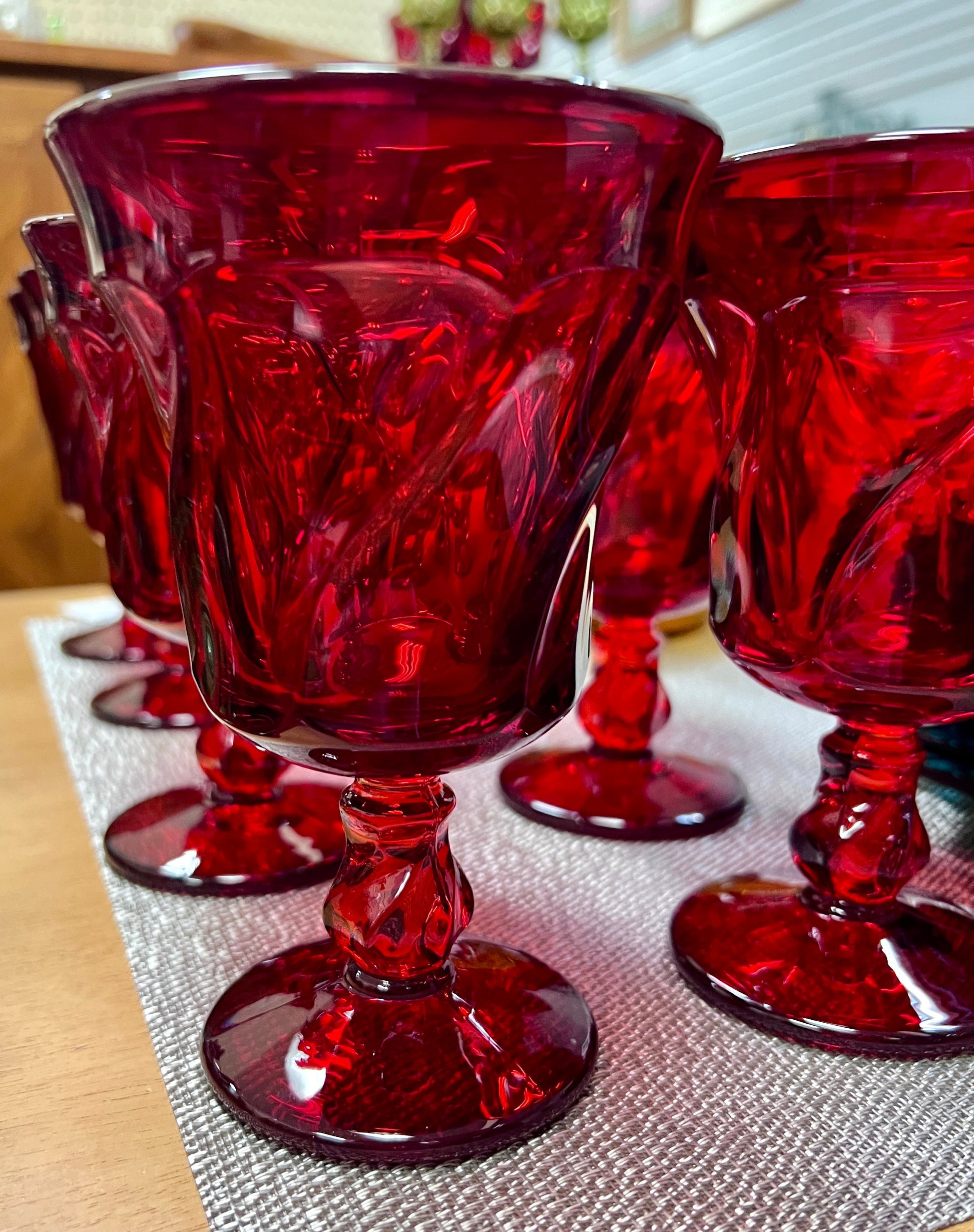 Set of 4 vintage Fostoria Jamestown Ruby mid century modern water goblets. The Jamestown pattern was produced from 1964 to 1982. The glasses are beautiful with pressed swirled panels, vibrant color and a slightly flared rim.