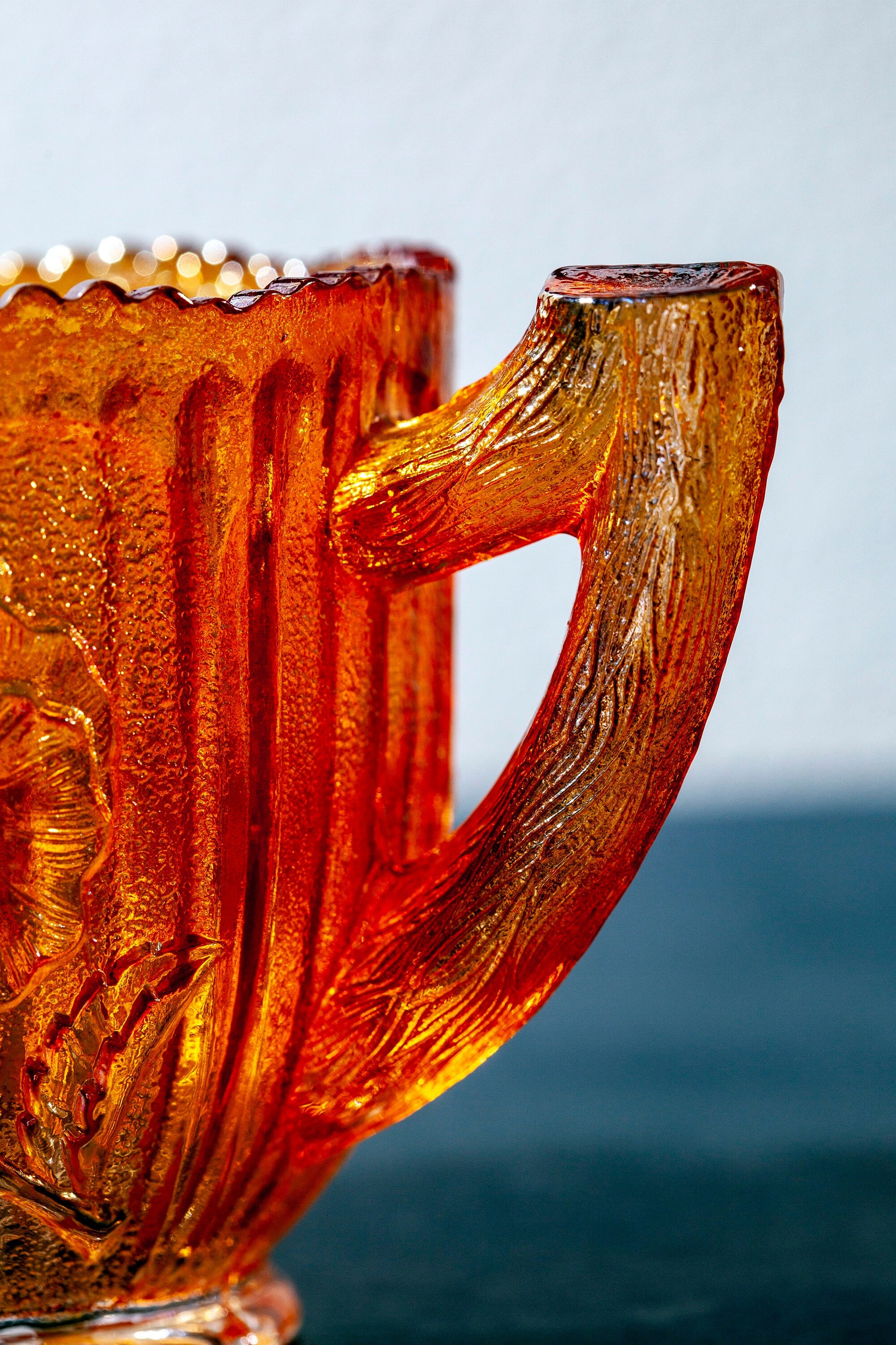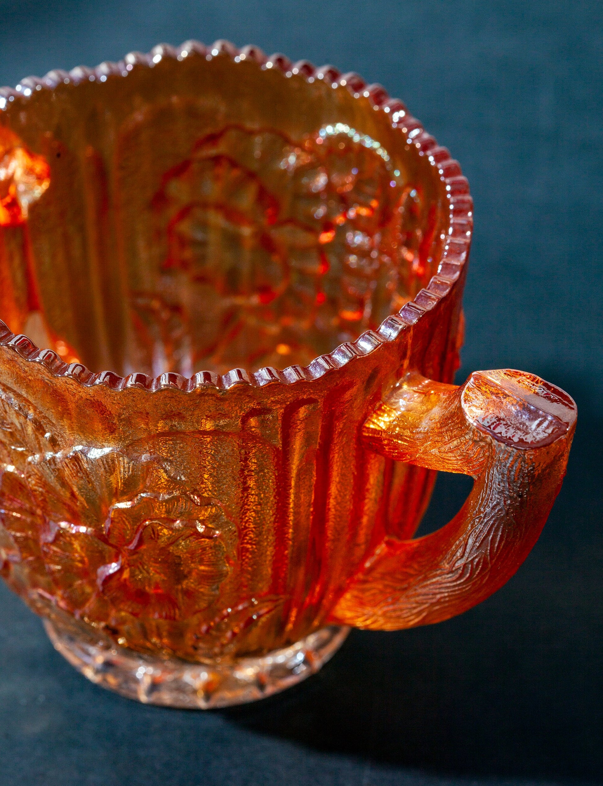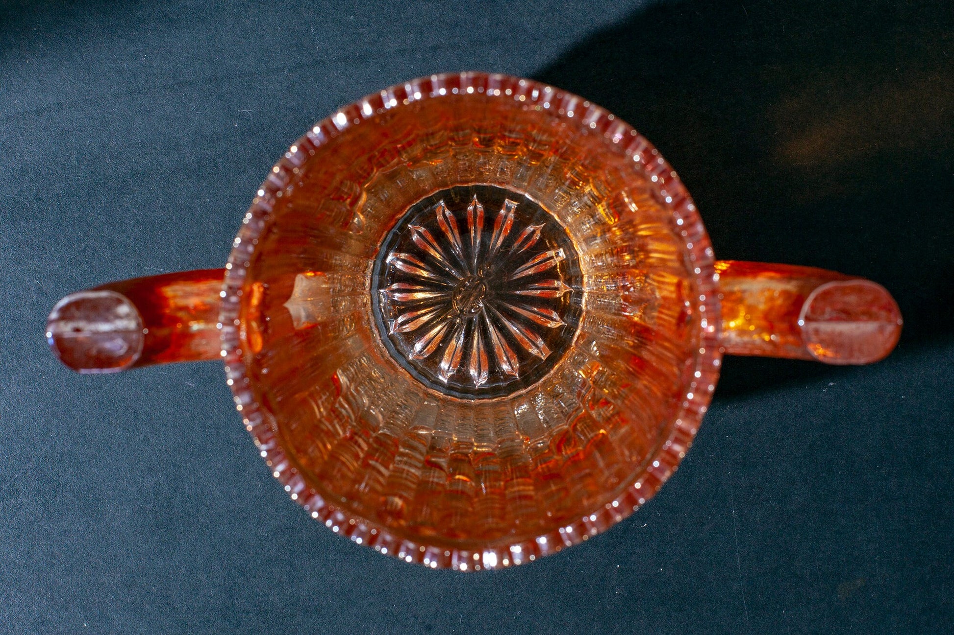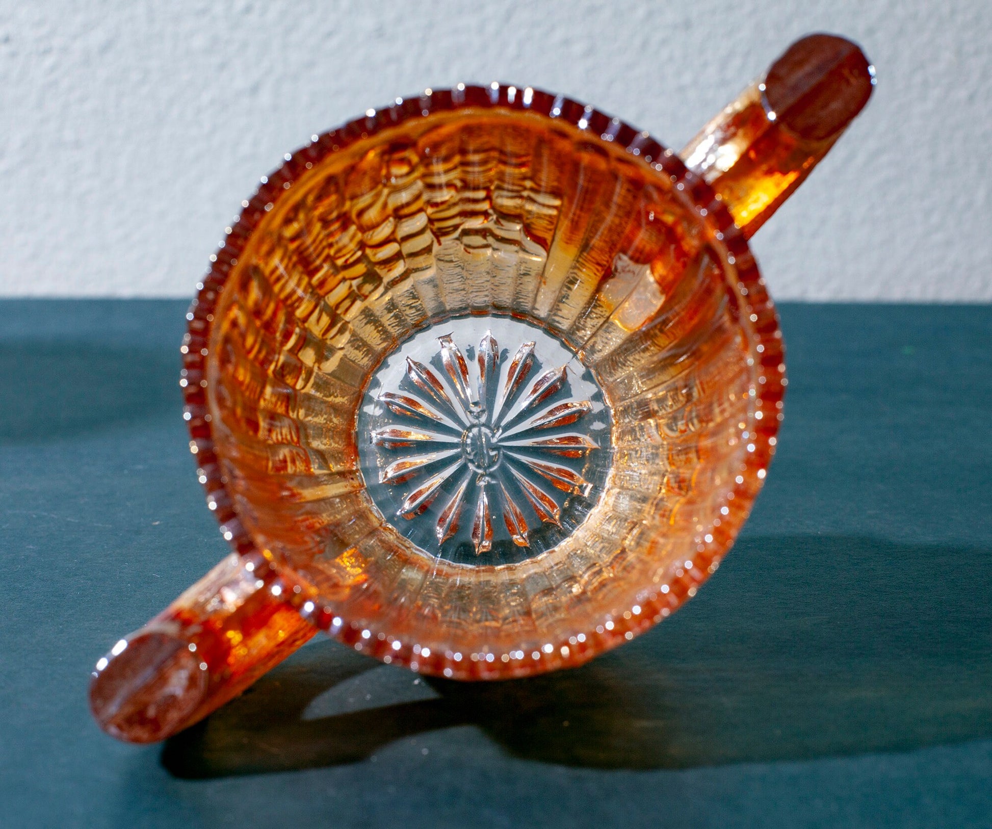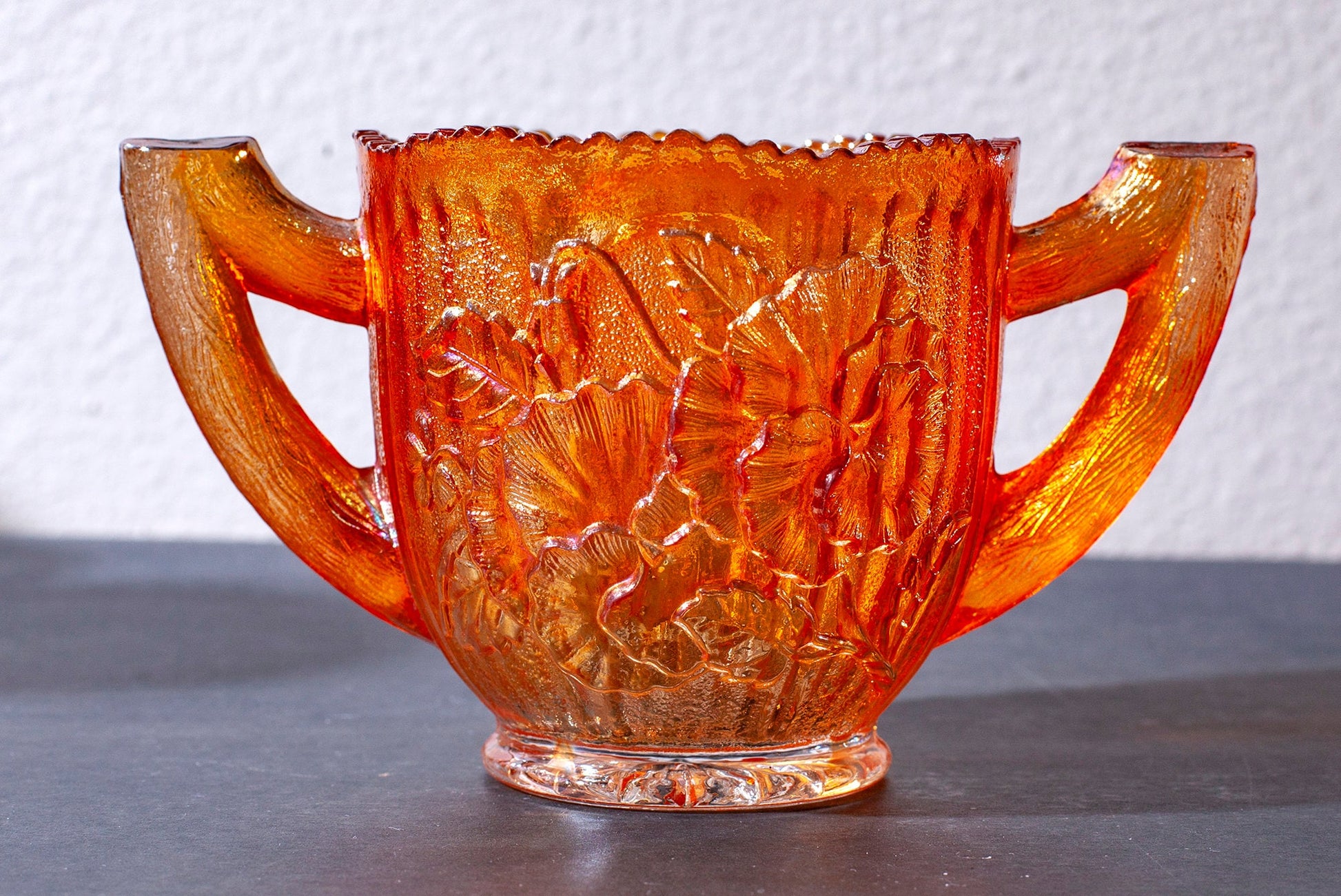 Absolutely beautiful vintage Imperial Glass Marigold Pansy carnival glass sugar bowl. It is a beautiful orange color, is iridescent, and has a ripple pattern on the inside with a soft sawtooth rim. The pansy pattern is on the front and back of the bowl, and the handles are pressed with a wood grain pattern.