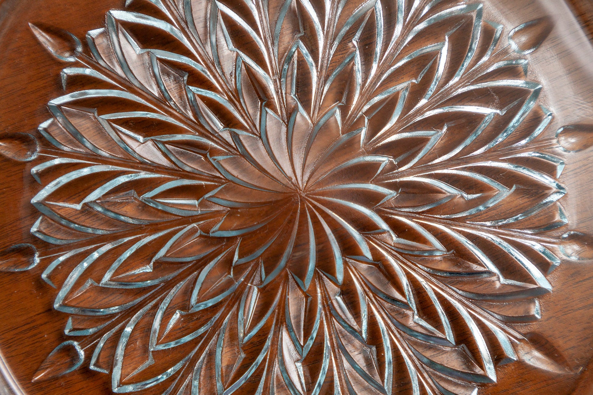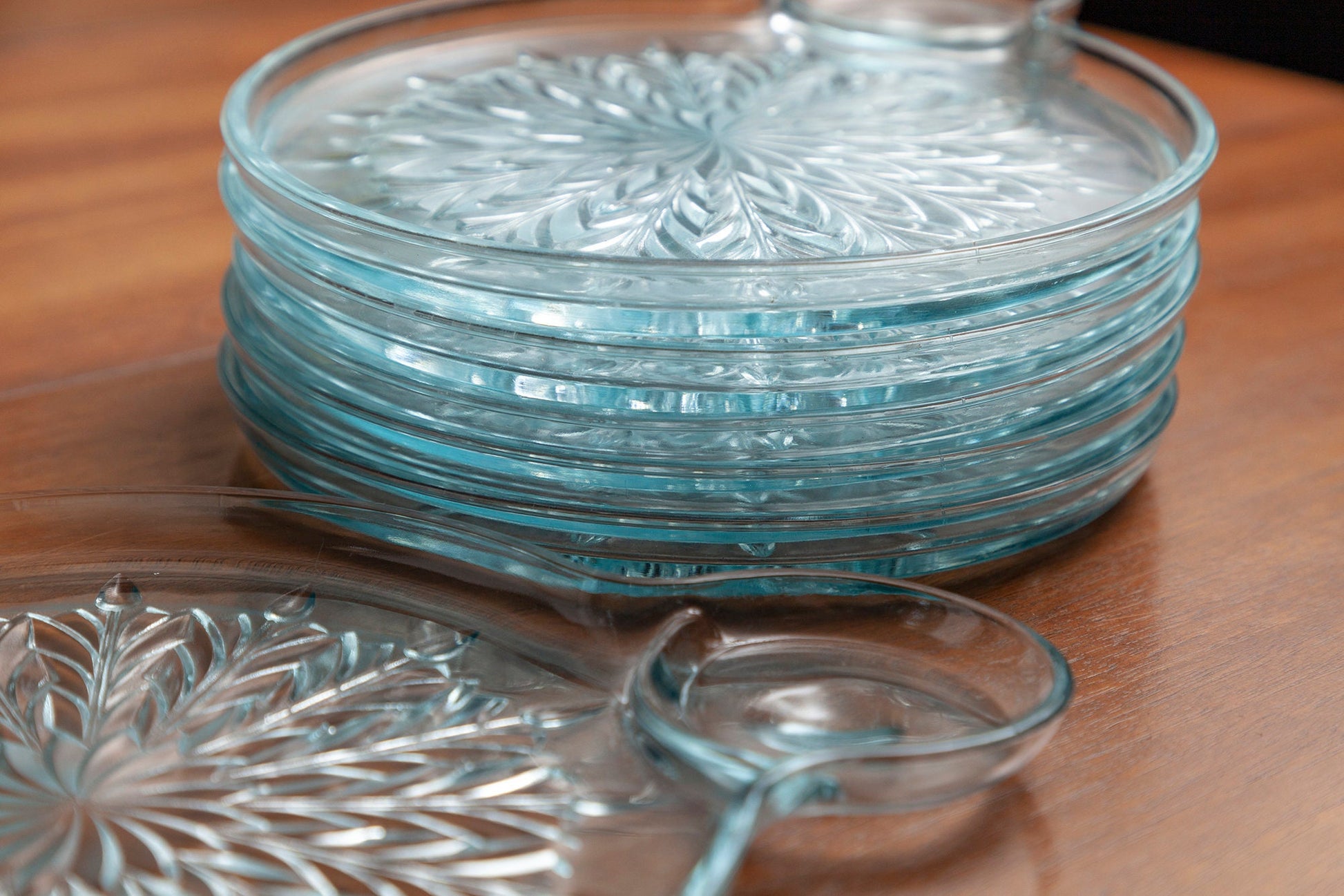 Rare Vintage Jeannette Feather Ice Blue Snack Plates (Set of 6) Early 50's and fabulous ice blue pressed glass plates with a circular feather pattern (almost looks like a snowflake!).