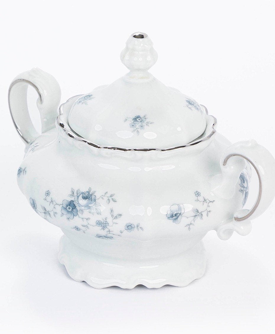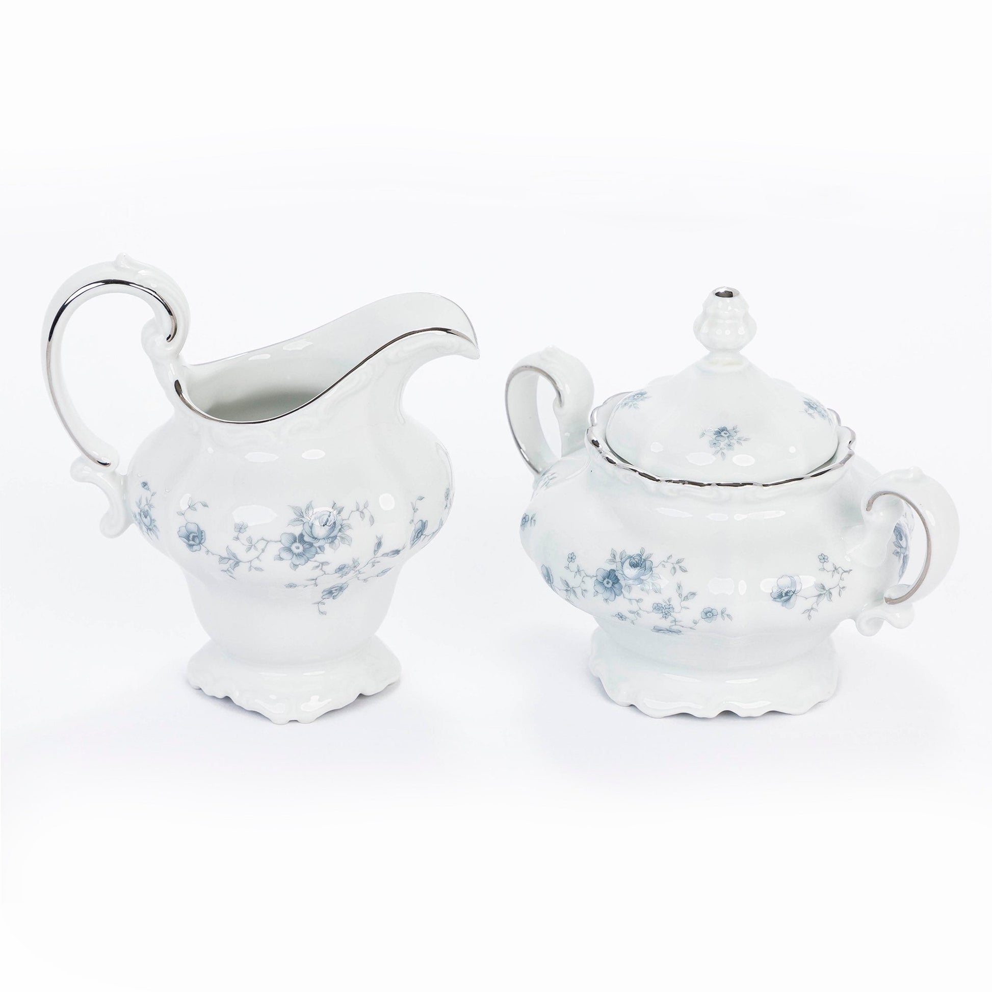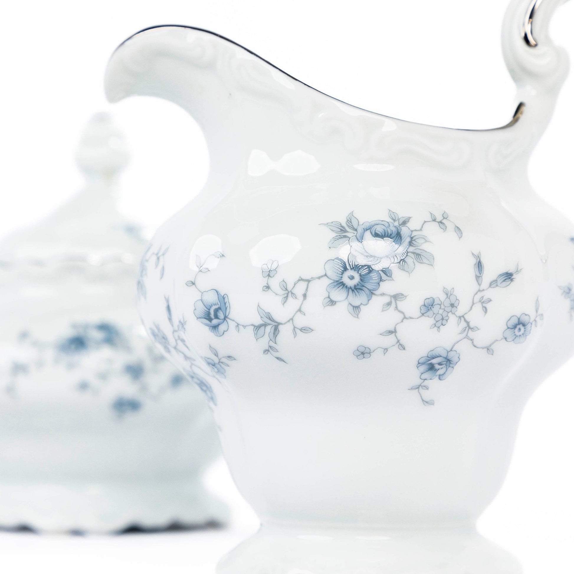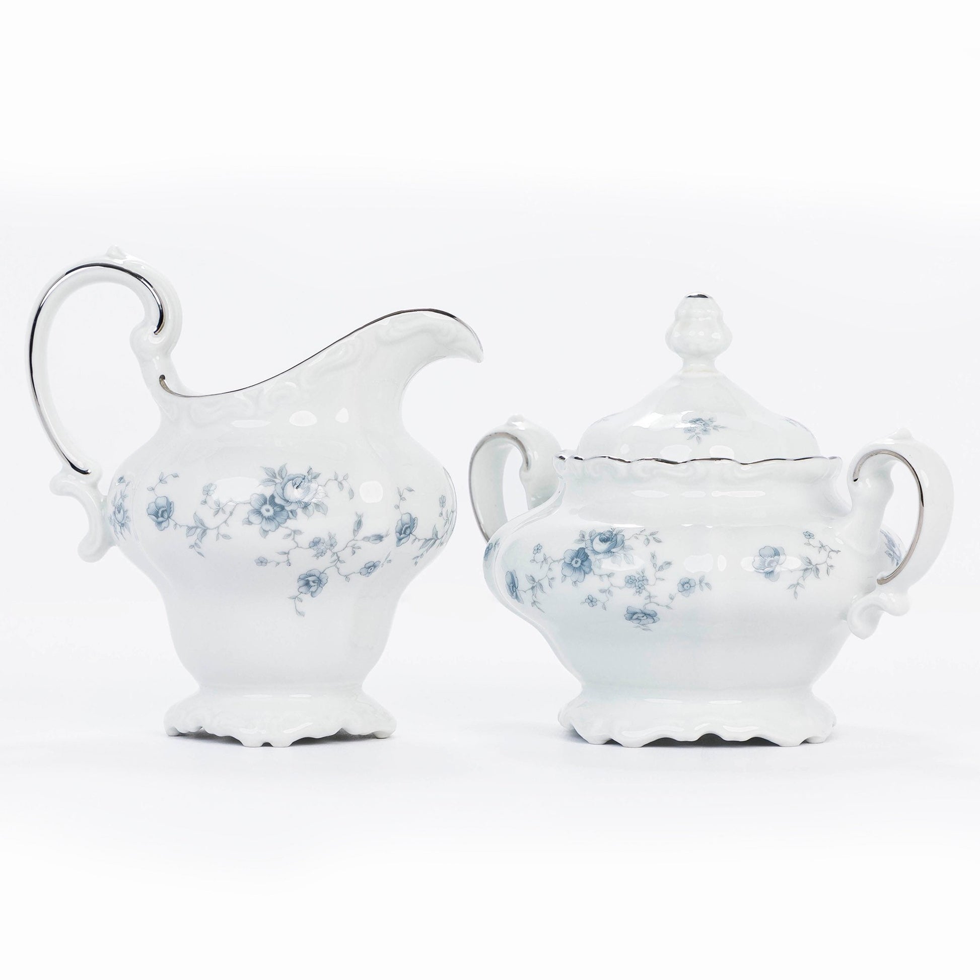 Vintage Haviland Blue Garland Creamer and Sugar Bowl are accented with delicate blue flowers and glistening platinum trim. The sculpted shape and floral pattern are reminiscent of traditional Victorian dinnerware. Each is in good vintage condition with minimal signs of wear and no chips, cracks or crazing.