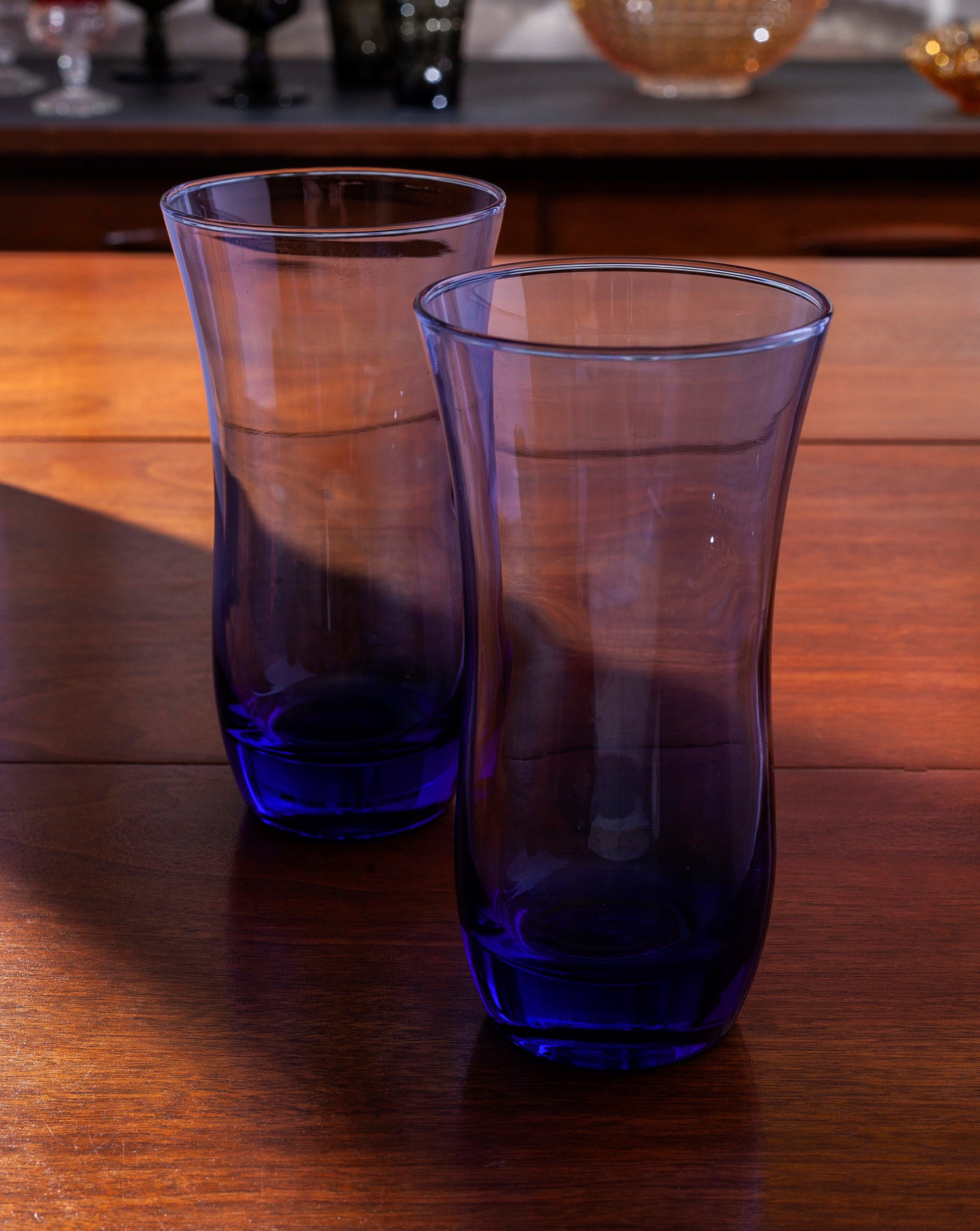 Vintage mid century modern Libbey Glass Co. Blue Tumblers (Set of 2). These are all about the flared rim! Beautiful solid blue glassware, hourglass shape, made in the 1970's.