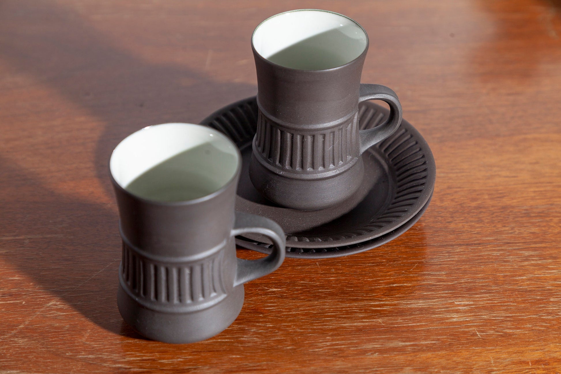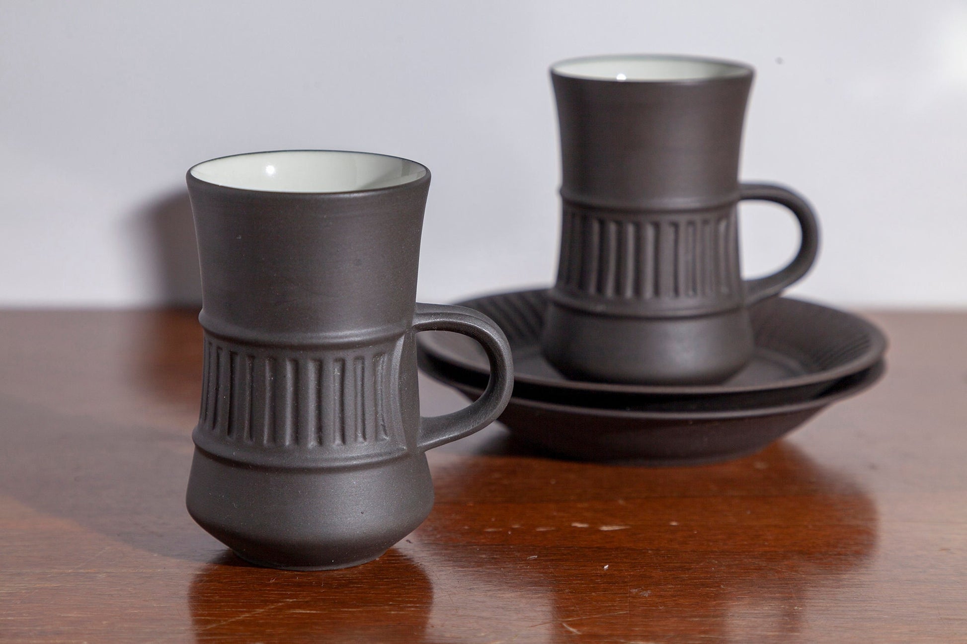 Set of 2 Mid Century Modern Dansk Flamestone Fluted Brown Flat Demitasse Cup and Saucers. The slightly fluted shape of the demitasse cup, its vertical ridges and its clean lines epitomize mid century modern design, as does its dark brown exterior contrasted with a white smooth interior. The ridges appear around the saucer rim as well.
