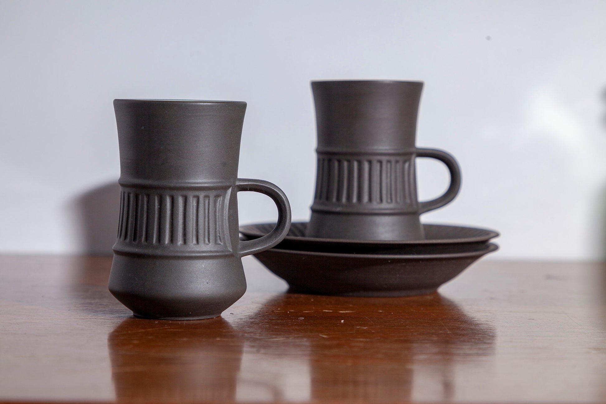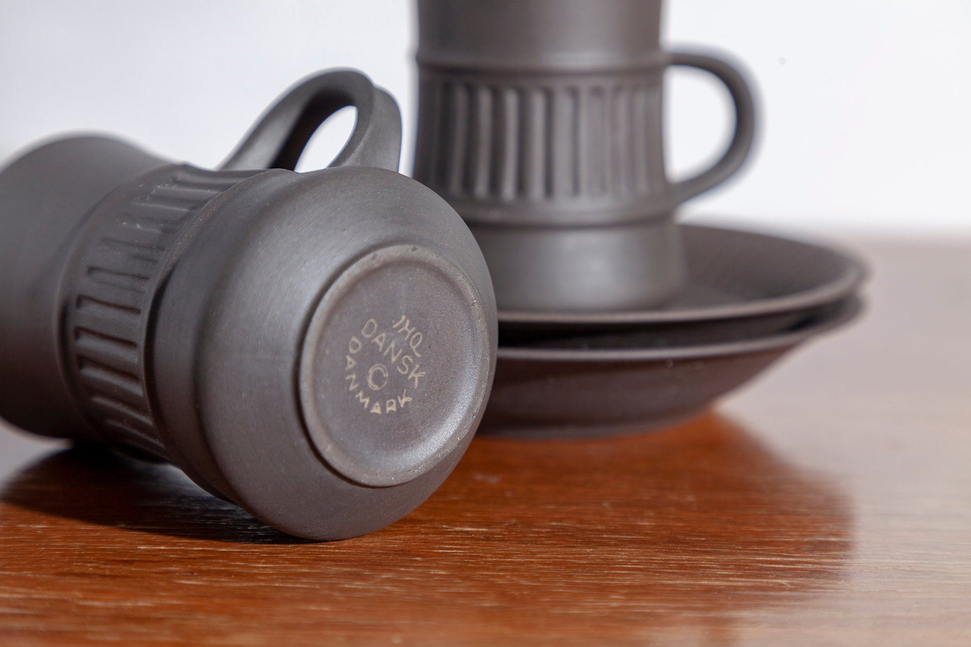 Vintage Mid Century Modern Dansk Flamestone Fluted Brown Flat Demitasse Cup and Saucer (Set of 2)