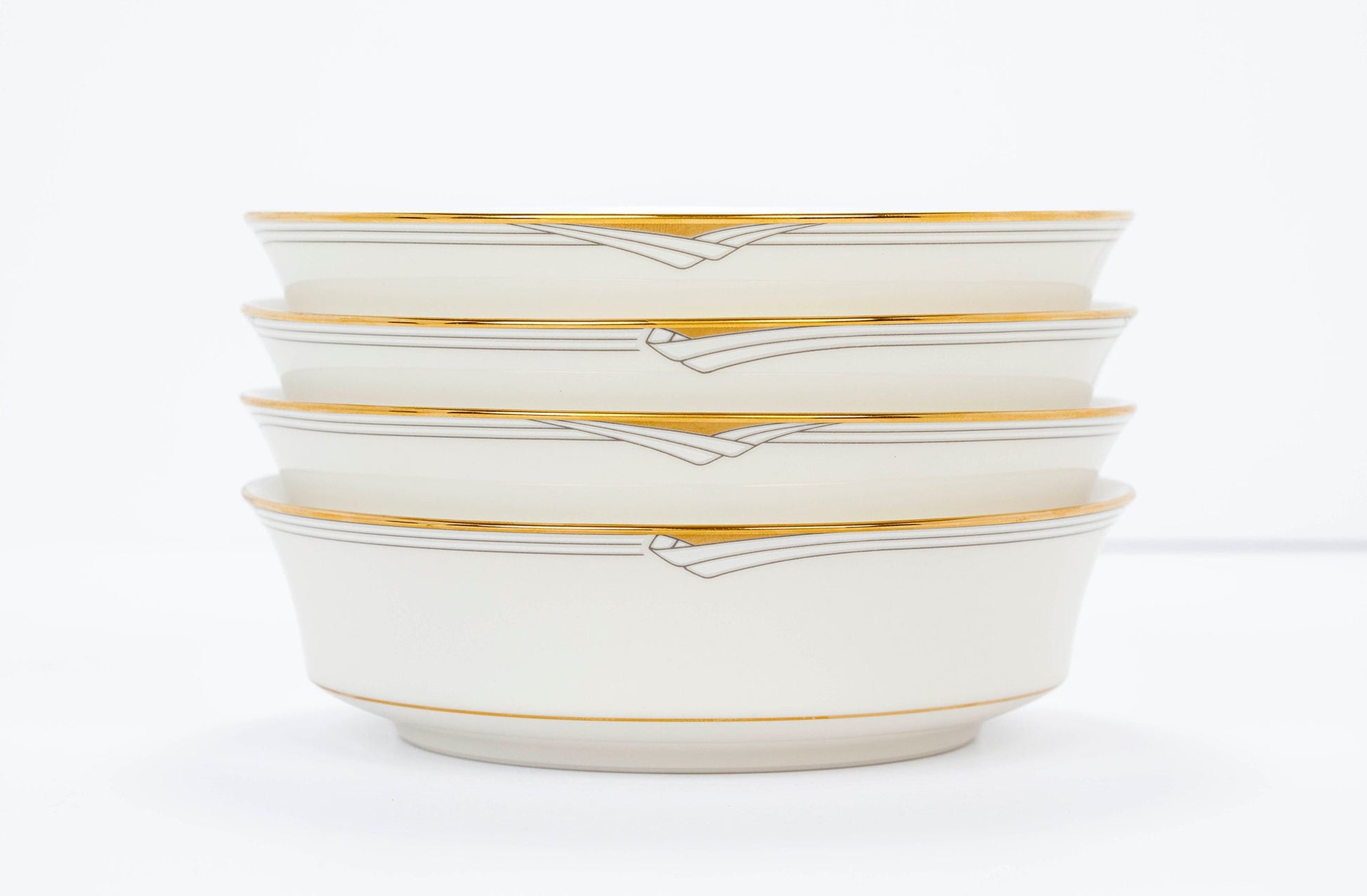 Vintage Noritake China Golden Cove Coupe Soup Bowls (Set of 4). Each coupe soup bowl is 6 1/2" in diameter, has a height of 1 7/8", and has a banded trim containing a gray geometric line pattern with gold edging. The pattern is simple, elegant and evokes a mid-century modern feel. Excellent vintage condition, appear to have been hardly used, and have no chips, cracks, or crazing. Noritake produced the Golden Cove pattern in the late 1980's, and it is hard to find and in demand.